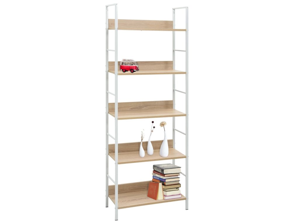 Tento regál na knihy je vyrobený z kompozitného dreva, takže sa dá ľahko očistiť navlhčenou handričkou. Robustná oceľová konštrukcia je odolná voči hrdzi a umocňuje industriálny štýl regálu. Úložný regál má kompaktný dizajn, a preto sa skvele hodí do menších priestorov. Skrinka má 5 políc, ktoré poskytujú množstvo priestoru na odkladanie a vystavenie zbierky kníh, kvetov, CD, DVD či rôznych dekoratívnych predmetov.
