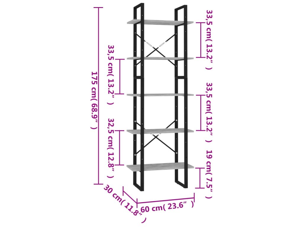 Knižnica je vyrobená z kvalitného kompozitného dreva a kovového rámu, vďaka čomu je pevná, trvácna a má dlhú životnosť. Je vybavená 5 poličkami, ktoré ponúkajú dostatok priestoru na odkladanie kníh, časopisov a rôznych dekoratívnych predmetov. Knižnica sa dá ľahko očistiť vlhkou handričkou.