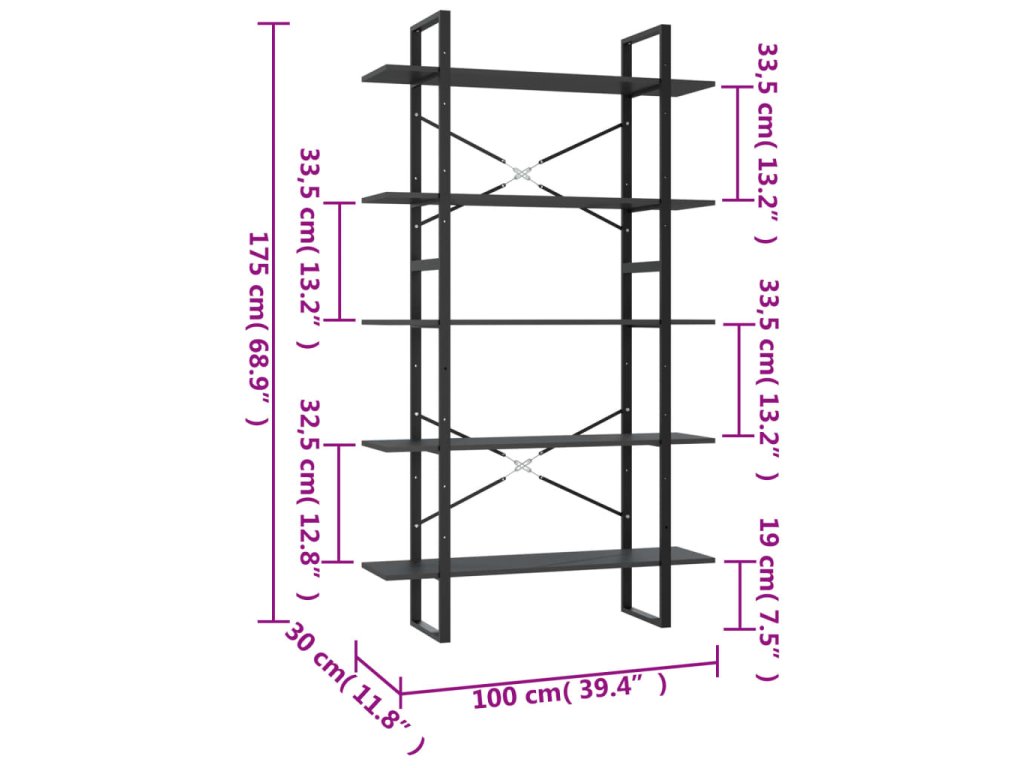 Knižnica je vyrobená z kvalitného kompozitného dreva a kovového rámu, vďaka čomu je pevná, trvácna a má dlhú životnosť. Je vybavená 5 poličkami, ktoré ponúkajú dostatok priestoru na odkladanie kníh, časopisov a rôznych dekoratívnych predmetov. Knižnica sa dá ľahko očistiť vlhkou handričkou.