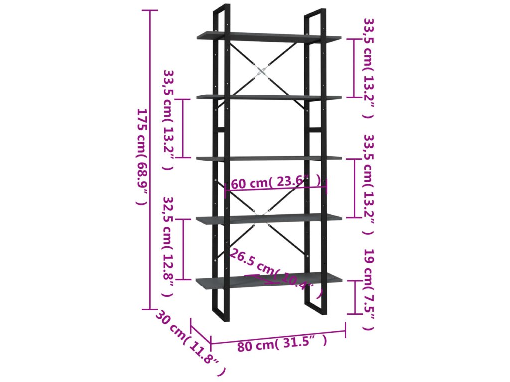 Knižnica je vyrobená z kvalitného kompozitného dreva a kovového rámu, vďaka čomu je pevná, trvácna a má dlhú životnosť. Je vybavená 5 poličkami, ktoré ponúkajú dostatok priestoru na odkladanie kníh, časopisov a rôznych dekoratívnych predmetov. Knižnica sa dá ľahko očistiť vlhkou handričkou.
