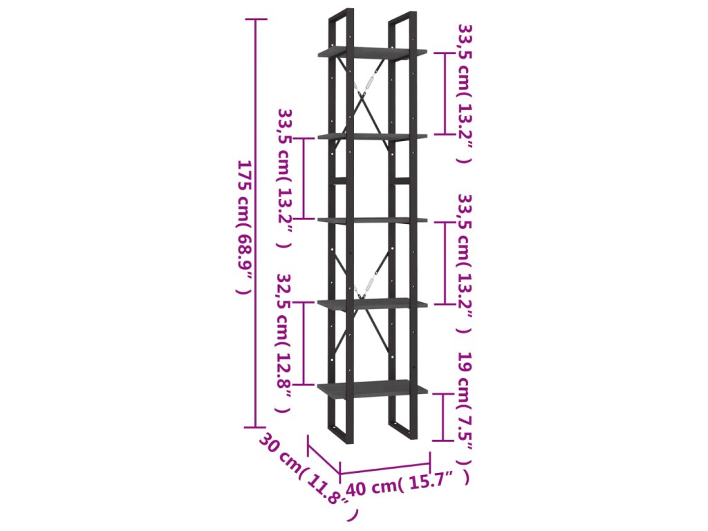 Knižnica je vyrobená z borovicového dreva a kovového rámu, čo zaručuje jej odolnosť, trvácnosť a dlhodobú životnosť. Je vybavená 5 poličkami a ponúka dostatok úložného priestoru na umiestnenie kníh, časopisov a iných dekoratívnych predmetov. Knižnica sa ľahko čistí vlhkou handričkou.