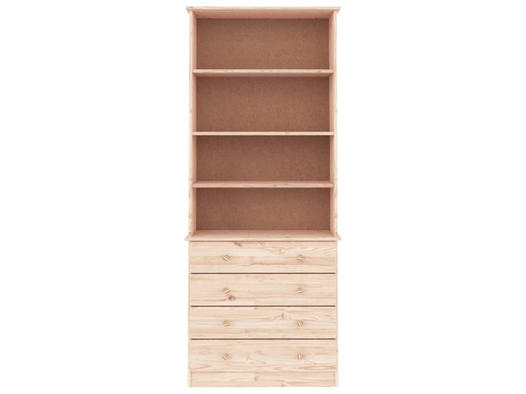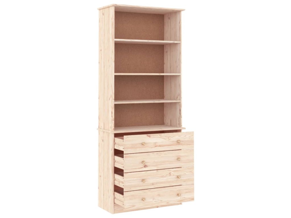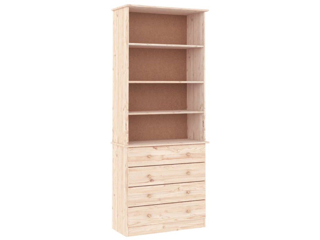 - Borovicový masív: Borovicový masív je krásny prírodný materiál. Borovicové drevo má rovnú kresbu a nachádzajú sa na ňom uzly, ktoré tomuto materiálu dodávajú charakteristický rustikálny vzhľad. Regál na knihy je vyrobený z masívneho borovicového dreva a je odolný a pevný.