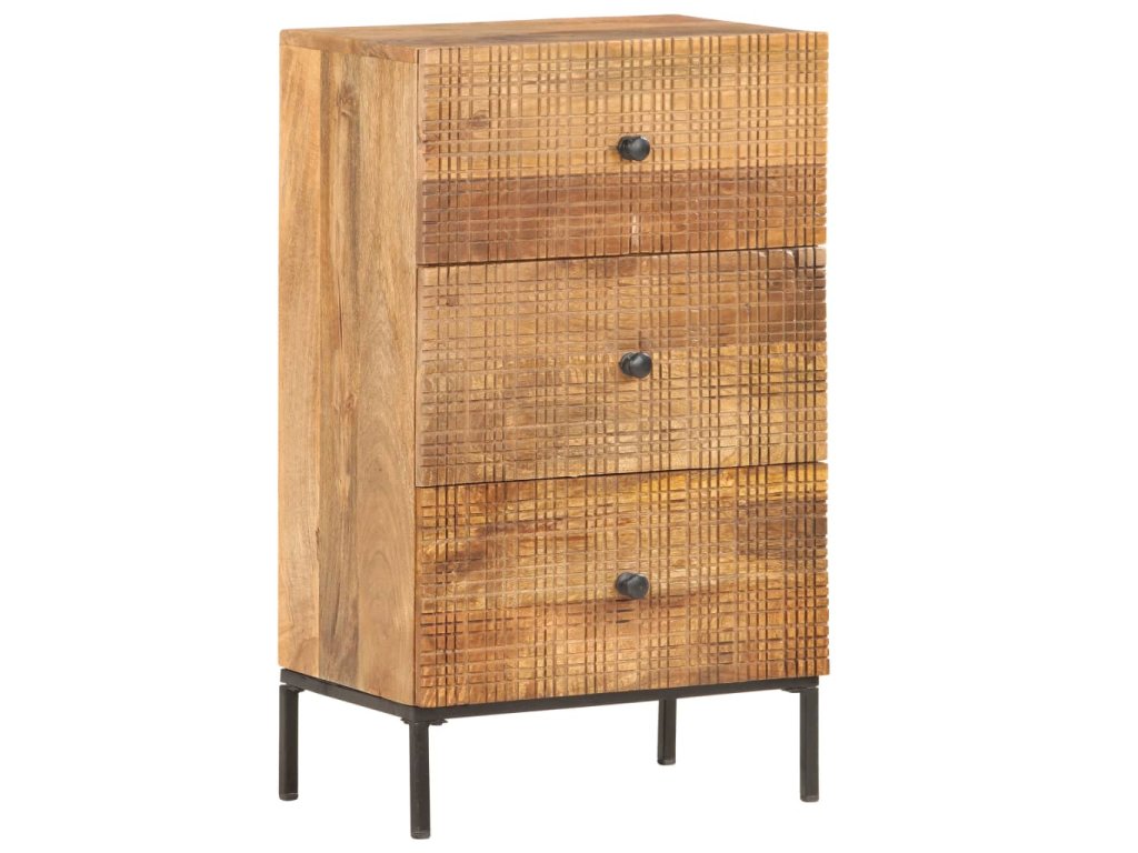 Komoda s ručne vyrezávanými mriežkami v prednej časti je ručne vyrobená z masívneho mangovníkového dreva, čo je husté a pevné tvrdé drevo s krásnymi hnedými alebo zlatými pruhmi a kontúrami na povrchu. Každý krok procesu výroby sa vykonáva s najväčšou starostlivosťou, či už ide o leštenie alebo lakovanie a remeselné spracovanie mu dodáva veľkolepý retro štýl. Vďaka krásnej drevenej štruktúre bude každý kus nábytku jedinečný a mierne odlišný od iných kusov. Oceľový rám s práškovaným povrchom prispieva k priemyselnému štýlu. Okrem toho má táto skrinka 3 zásuvky, ktoré poskytujú dostatočný priestor pre uloženie všetkých menších predmetov, ktoré chcete mať na dosah ruky. Montáž je jednoduchá.