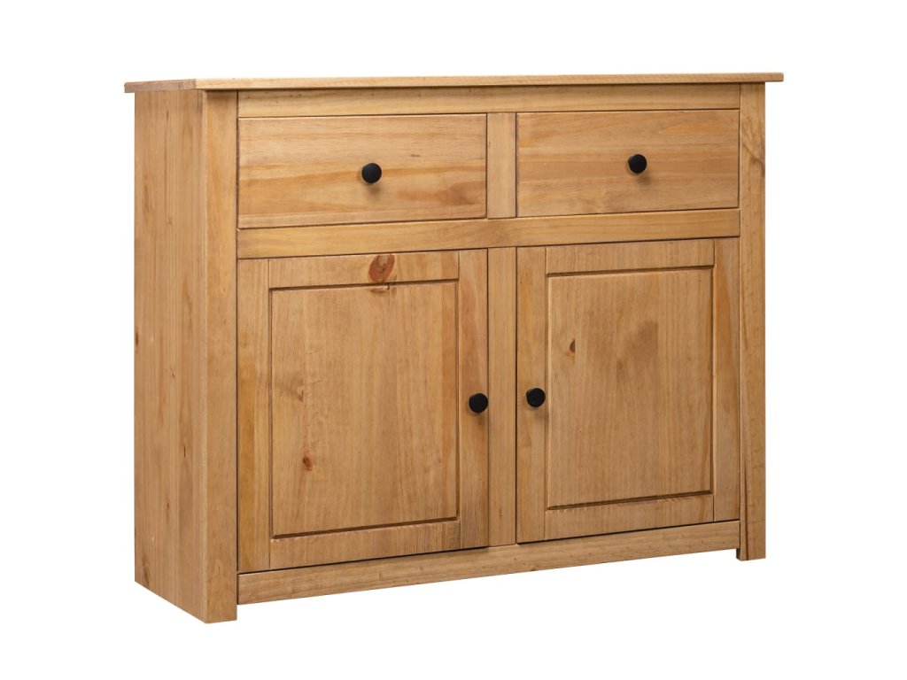Komoda navrhnutá s 2 zásuvkami a 2 dvierkami udržuje vaše časopisy, knihy, DVD a multimediálne zariadenia dobre usporiadané a na dosah. Pevný vrchná doska je ideálna na umiestnenie dekoratívnych predmetov, ako sú vázy alebo kvetináče. Skrinka je vyrobená z borovicového masívu. Každý krok procesu výroby sa vykonáva s najväčšou starostlivosťou, či už ide o leštenie, natieranie alebo lakovanie. Vďaka vynikajúcemu remeselnému spracovaniu a esteticky príťažlivej štruktúre dreva je každý kus nábytku jedinečný a mierne sa odlišuje od ostatných.