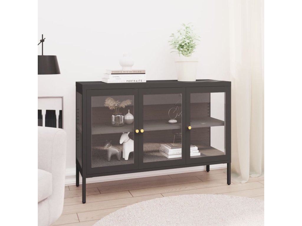 Konštrukcia tejto komody je vyrobená z ocele. Je pevná a odolná, čo zaručuje roky používania. Komoda má v sklenených dvierkach priehradku, ktorá ponúka dostatok úložného priestoru na uloženie a vystavenie vašich kníh, časopisov, DVD, váz a iných dekoratívnych predmetov, ktoré budú dobre usporiadané a na dosah ruky. Policu je možné nainštalovať do rôznej úrovne, aby sa zmenila veľkosť úložného priestoru. Nohy sa dajú ľahko nastaviť na požadovanú výšku a pomáhajú skrinke udržať stabilitu. Skrinka sa ľahko čistí vlhkou handričkou.