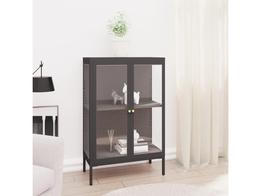 Konštrukcia tejto komody je vyrobená z ocele. Je pevná a odolná, čo zaručuje roky používania. Komoda má v sklenených dvierkach priehradku, ktorá ponúka dostatok úložného priestoru na uloženie a vystavenie vašich kníh, časopisov, DVD, váz a iných dekoratívnych predmetov, ktoré budú dobre usporiadané a na dosah ruky. Policu je možné nainštalovať do rôznej úrovne, aby sa zmenila veľkosť úložného priestoru. Nohy sa dajú ľahko nastaviť na požadovanú výšku a pomáhajú skrinke udržať stabilitu. Skrinka sa ľahko čistí vlhkou handričkou.