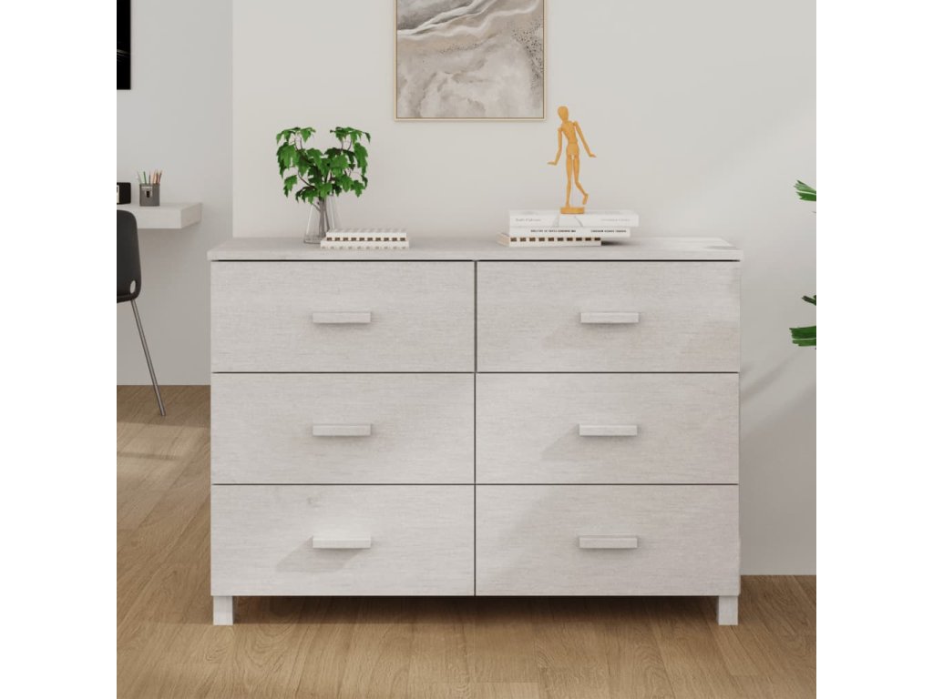 Skrinka so zásuvkami je vyrobená z borovicového masívu, vďaka čomu je stabilná a pevná. Komoda má 6 zásuviek, ktoré sa ľahko vysúvajú a poskytujú množstvo priestoru na prehľadné odkladanie bežných potrieb, ktoré tak budete mať vždy poruke. Robustná stolová doska je ako stvorená na vystavenie dekoratívnych predmetov, ako sú rámiky s fotkami či kvety v kvetináčoch.