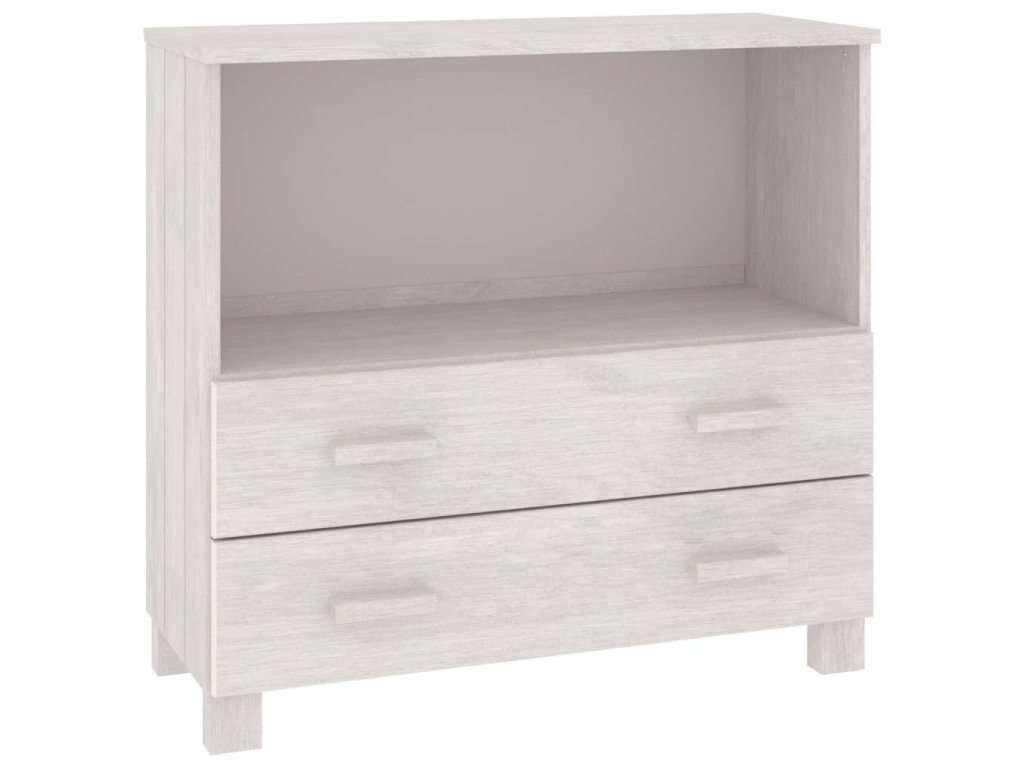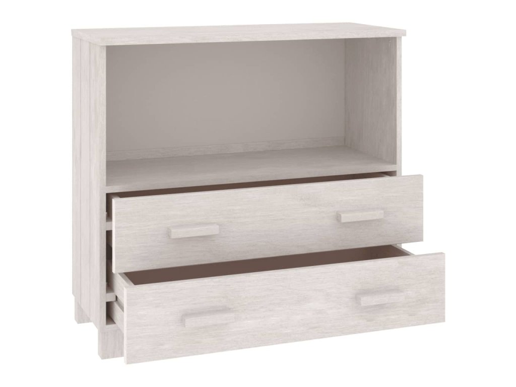 Zásuvková skrinka je vyrobená z masívneho borovicového dreva, vďaka čomu je stabilná a pevná. Komoda má 1 priehradku a 2 zásuvky, ktoré poskytujú dostatok úložného priestoru na uchovávanie každodenných potrieb dobre organizovaných a na dosah ruky. Pevná doska je ideálna na vystavenie dekoratívnych predmetov, fotorámikov a rastlín v črepníkoch.