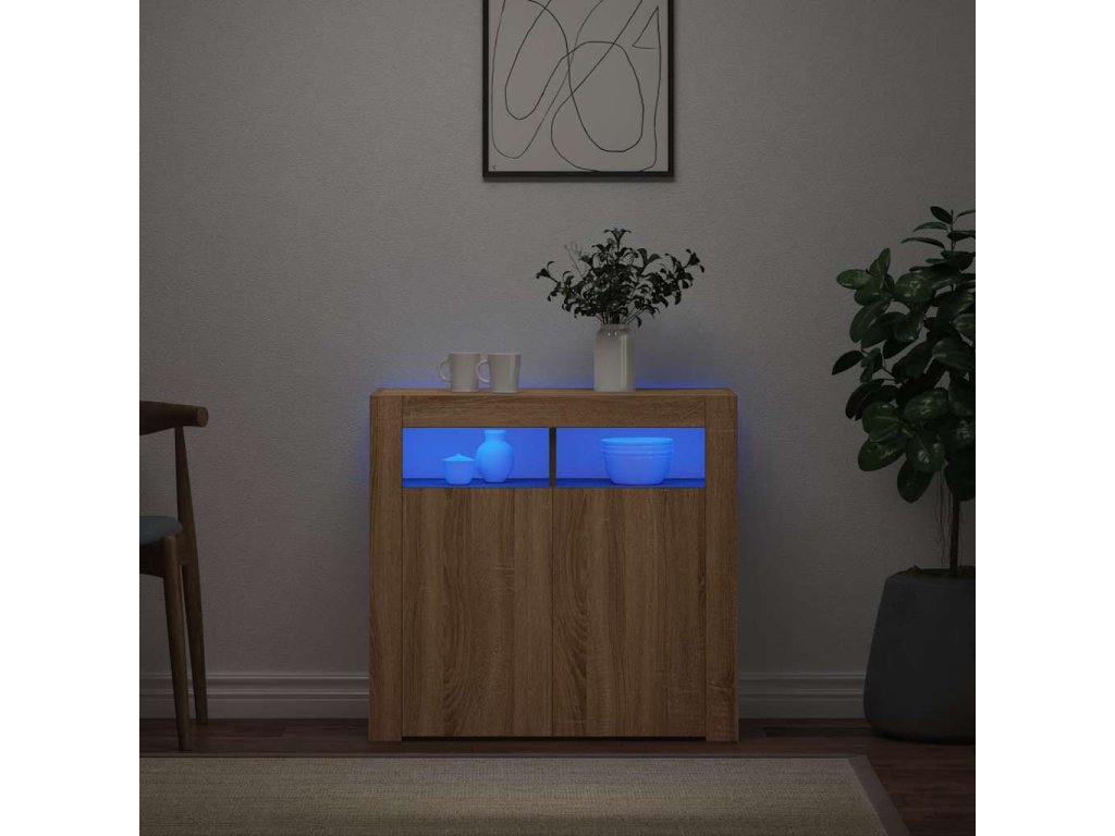 Vďaka robustnej konštrukcii je tento príborník mimoriadne odolný a pevný. Poskytuje dostatok úložného priestoru na knihy, multimediálne zariadenia a iné predmety. Robustná stolová doska je ideálna na vystavenie dekoratívnych predmetov, fotorámikov alebo rastlín v kvetináčoch. Táto skrinka je vybavená svetlami RGB LED, ktoré majú rôzne možnosti na zmenu farby svetla a umožňujú automatické menenie farieb. LED svetlá podčiarkujú moderný vzhľad komody a dávajú jej trendy šarm.