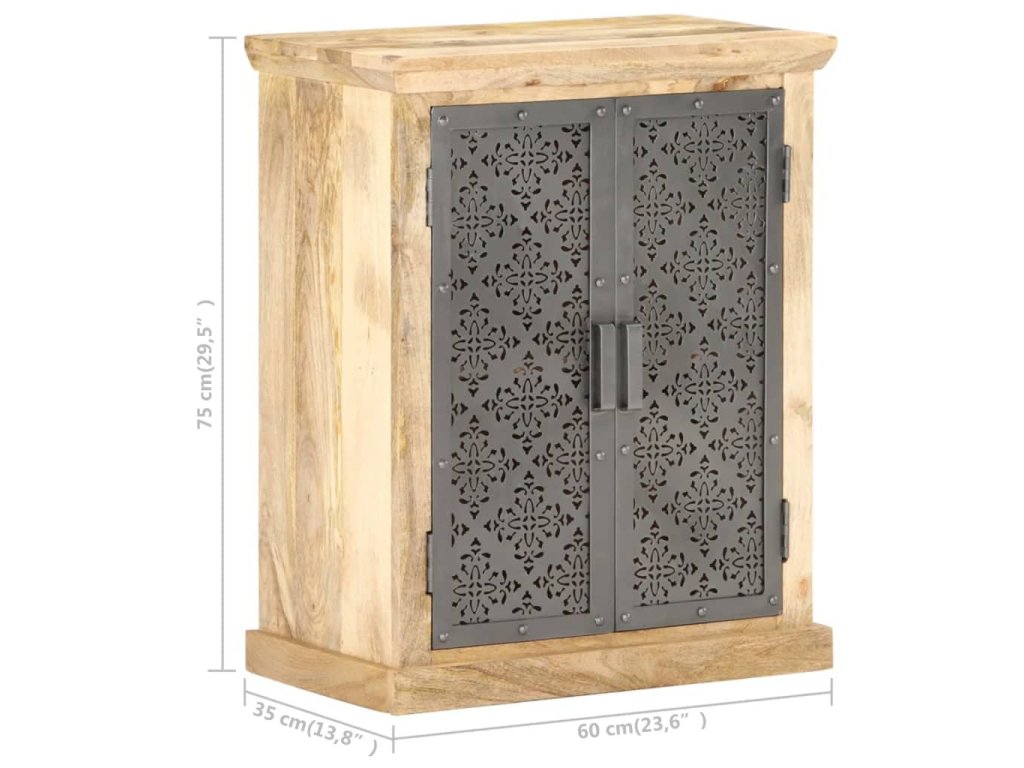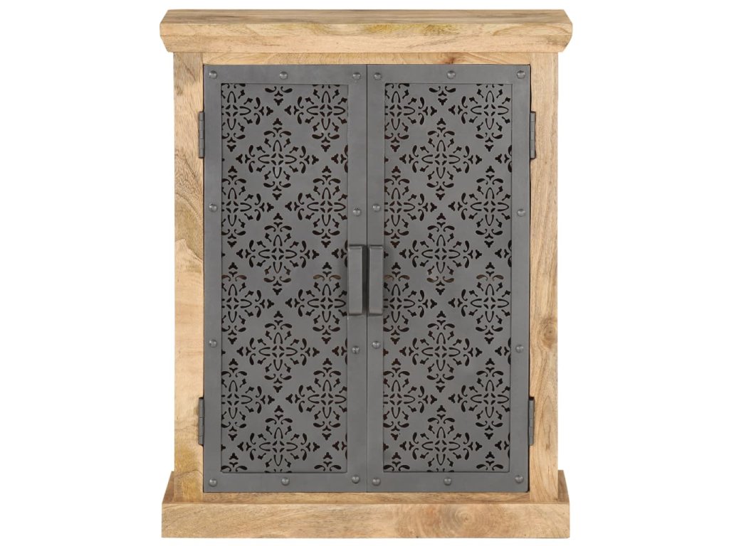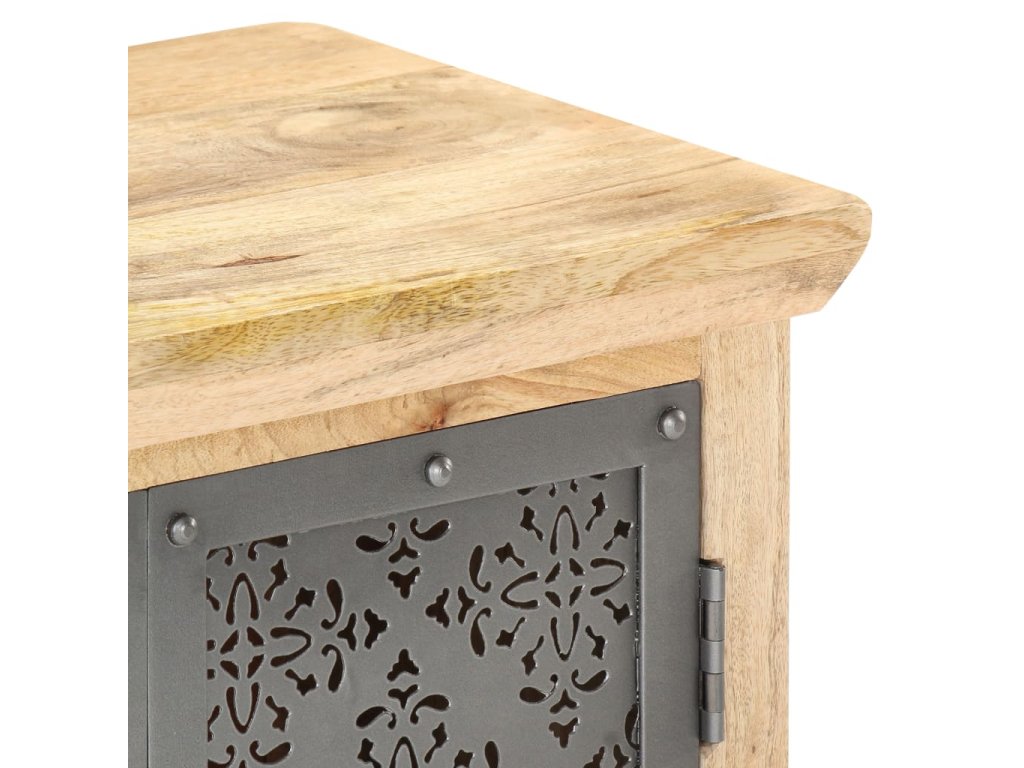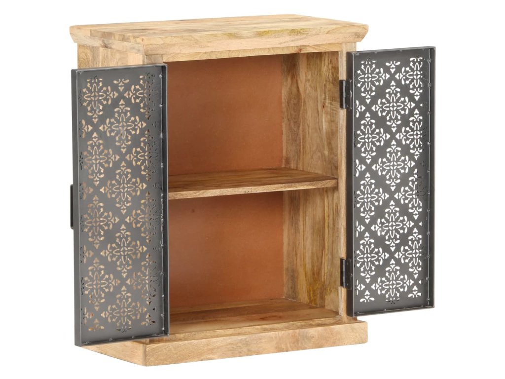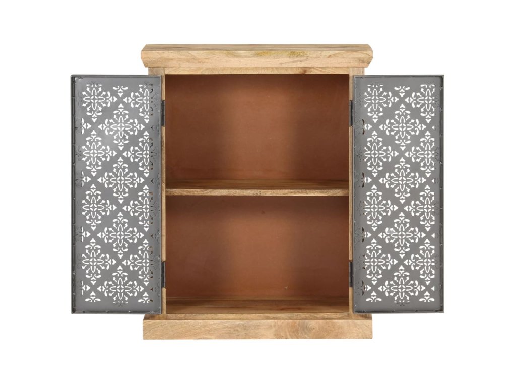 Táto bočná skrinka, vyrobená z mangového masívneho dreva, je nádherne upravená leštením, maľovaním a lakovaním, vďaka čomu vyniká rafinovaným vzhľadom. Oceľové dvere s dierovaným dizajnom skrinke ešte pridávajú na kráse. Ponúka dostatočný úložný priestor pre vaše knihy, časopisy alebo iné predmety, ktoré tak budú ľahko dostupné. Ľahko sa tiež čistí a udržuje vlhkou handričkou.