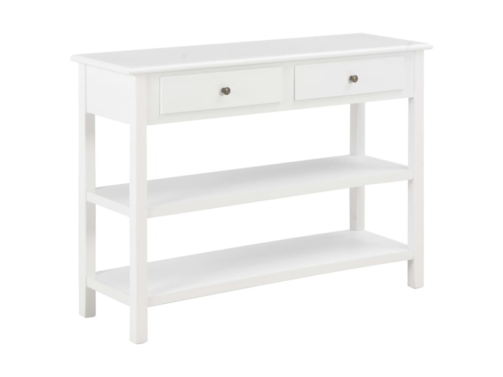 Táto komoda je vyrobená z drevotriesky (MDF). Je mimoriadne pevná a odolná. Bočná skrinka má 2 zásuvky a 2 police, ktoré poskytujú dostatočný priestor na uloženie predmetov, ako sú kľúče, poznámkové bloky, perá a ďalšie drobnosti, ktoré potrebujete mať na dosah ruky. Veľká vrchná doska je navyše ideálna na umiestenie multimediálnych zariadení alebo na zobrazovanie ozdobných predmetov. Montáž komody je jednoduchá.