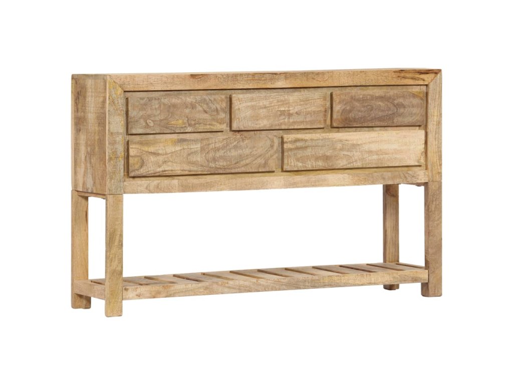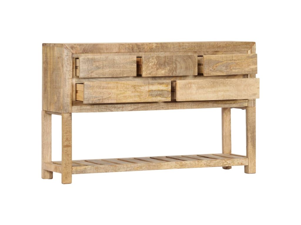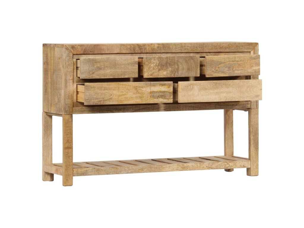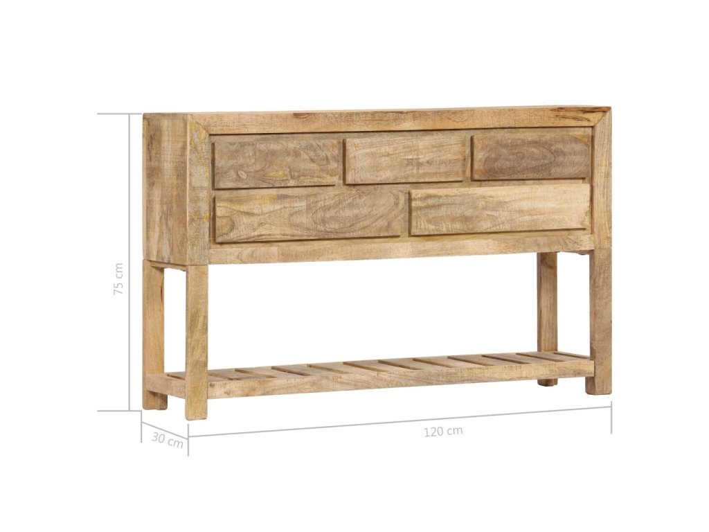 Tento retro konzolový stolík je vyrobený z masívneho mangovníkového dreva, čo je tvrdé drevo s hustou štruktúrou. Hrubé mangovníkové drevo sa vyznačuje pevnosťou, ktorá unesie veľkú hmotnosť, a taktiež odolnosťou voči opotrebovaniu. V dôsledku toho je tento krásne navrhnutý bočný stolík mimoriadne stabilný, trvácny a pútavý. Je ručne vyrobený a vďaka peknej štruktúre dreva je každý kus tohto nábytku jedinečný a mierne odlišný od ostatných kusov. Okrem toho má táto starožitná komoda 5 zásuviek a 1 poličku, ktoré poskytujú dostatok priestoru na uloženie oblečenia, kníh, ale aj rôznych ďalších predmetov.