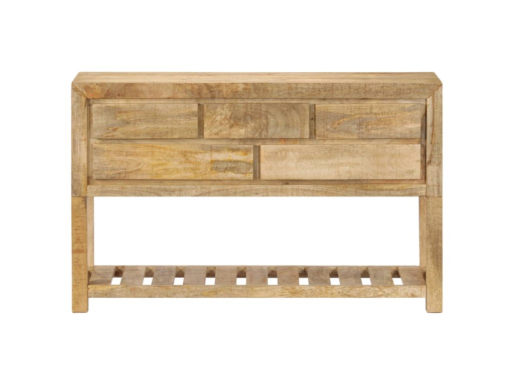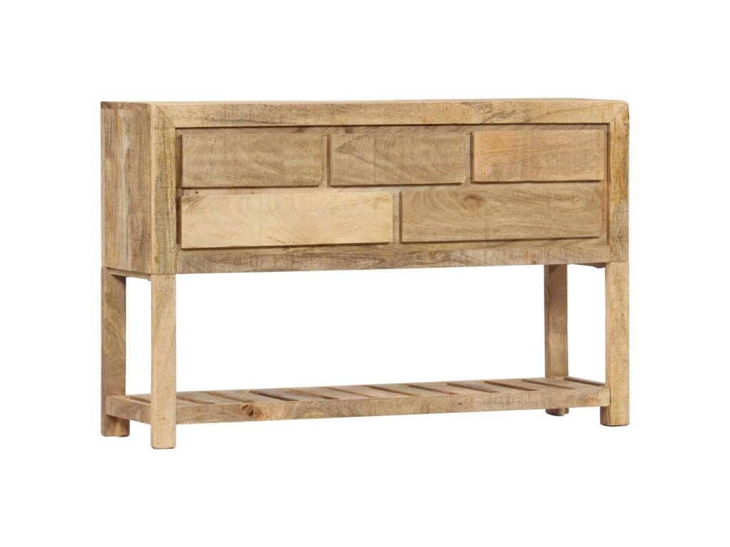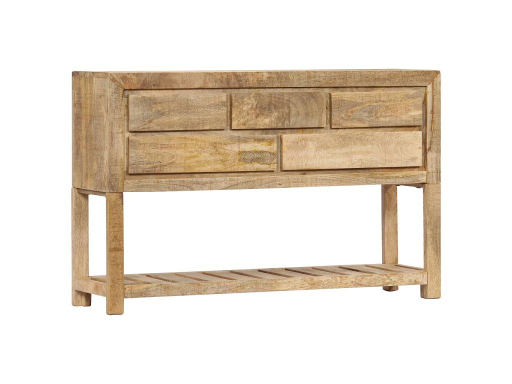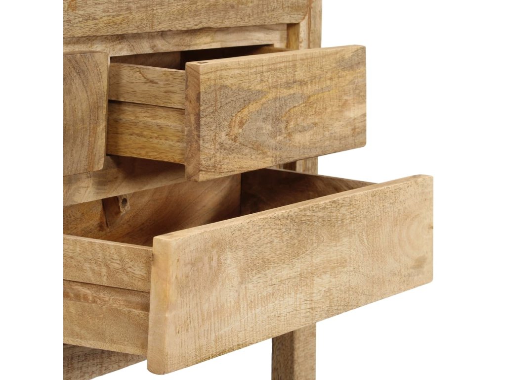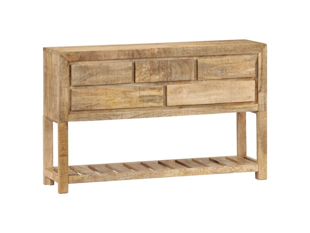 Tento retro konzolový stolík je vyrobený z masívneho mangovníkového dreva, čo je tvrdé drevo s hustou štruktúrou. Hrubé mangovníkové drevo sa vyznačuje pevnosťou, ktorá unesie veľkú hmotnosť, a taktiež odolnosťou voči opotrebovaniu. V dôsledku toho je tento krásne navrhnutý bočný stolík mimoriadne stabilný, trvácny a pútavý. Je ručne vyrobený a vďaka peknej štruktúre dreva je každý kus tohto nábytku jedinečný a mierne odlišný od ostatných kusov. Okrem toho má táto starožitná komoda 5 zásuviek a 1 poličku, ktoré poskytujú dostatok priestoru na uloženie oblečenia, kníh, ale aj rôznych ďalších predmetov.