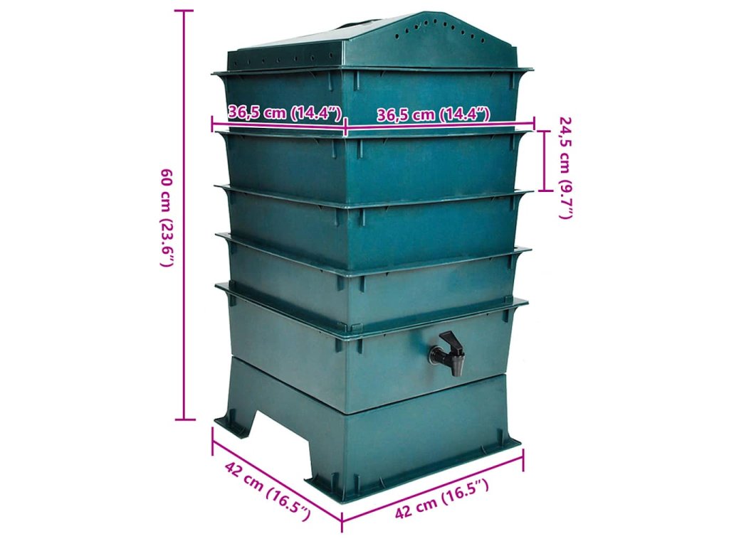 Kompostovanie, ktoré využíva červy, vám umožní premeniť zvyšky potravy a papierový či kartónový odpad na veľmi výživnú pôdu pre vaše rastliny. Vďaka nášmu kompostéru na červy sa celý proces podstatne zrýchli a zjednoduší. Do spodného zásobníku stačí umiestniť niekoľko červov a organický odpad z vašej domácnosti. Červy začnú spracovávať potravu. Keď bude spodný zásobník plný, môžete pridať ďalší zásobník. Červy budú migrovať smerom nahor za najnovším zdrojom potravy a v spodnom zásobníku nechajú kompost, ktorý je bohatý na výživné látky. Počas toho, ako sa odpad rozkladá, prechádza cez celý systém vlhkosť, vďaka čomu môžete získať organické tekuté hnojivo priamo z kohútika.