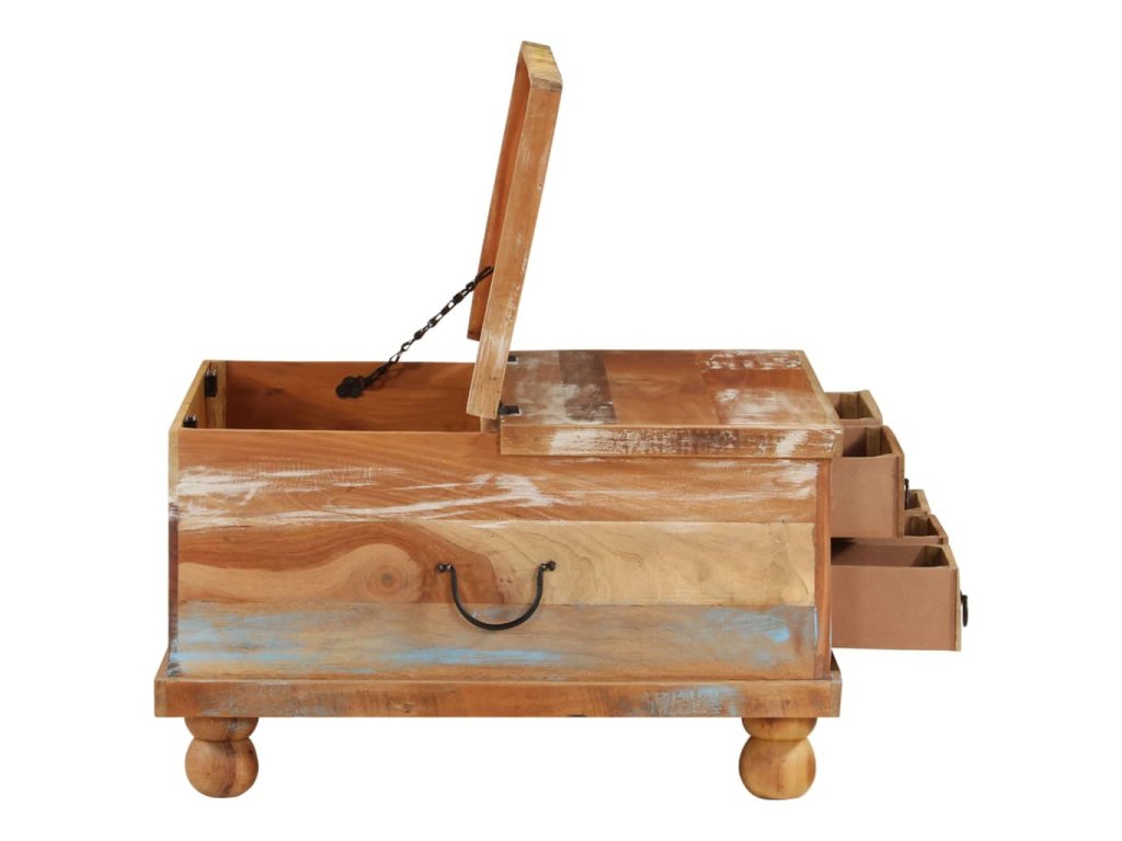 Konferenčný stolík v retro štýle je ručne vyrobený z recyklovaného dreva, ktoré je stabilné, trvácne a krásne a má podobné vlastnosti ako napríklad tíkové, mangové, akáciové, recyklované, tvrdé drevo a podobne. Každý krok výrobného procesu sa vykonáva s maximálnou starostlivosťou, či už je to leštenie, natieranie alebo lakovanie. Vďaka remeselnému opracovaniu a krásnej textúre dreva je každý kus nábytku jedinečný a trochu odlišný od ostatných. 5 zásuviek a veľký vnútorný priečinok navyše poskytujú množstvo priestoru na odkladanie rôznych predmetov, ktoré chcete mať vždy poruke.