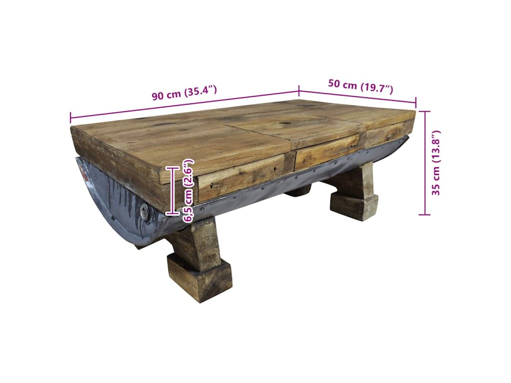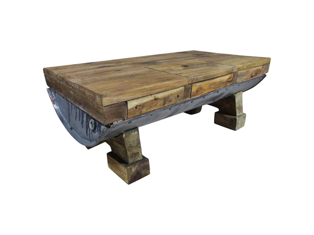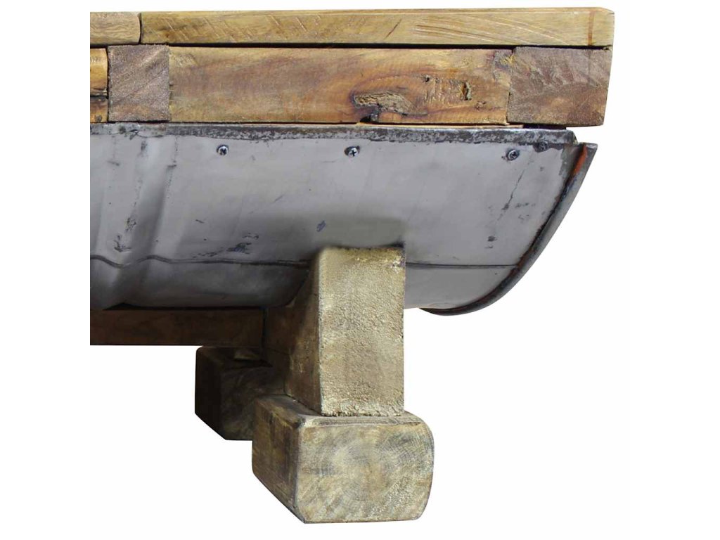 Doska stola a nožičky sú vyrobené z pevného recyklovaného dreva, ktoré má vlastnosti rôznych druhov drevín ako je napríklad mahagónové, teakové, mangovníkové alebo akáciové drevo. Recyklovaný sud z pozinkovaného železa zlepšuje pevnosť stola a dodáva stotlíku robustný priemyselný štýl. Na stolíku môžete nájsť diery, ktoré vznikli po odstránení klincov alebo skrutiek a ďalšie nedokonalosti, ktoré podčiarkujú jeho jedinečnosť. Tieto nedostatky odhaľujú bohatú históriu a nie sú úmyselne vytvorené. Drevo pochádza z prirodzene padnutých stromov, drevených lodí, drevených domov, atď. Každý kus tohto nábytku je jedinečný a mierne sa odlišuje od ďalších kusov. Znaky opotrebovania a ručná výroba dávajú každému stolíku jedinečný vzhľad a krásny vintage štýl.