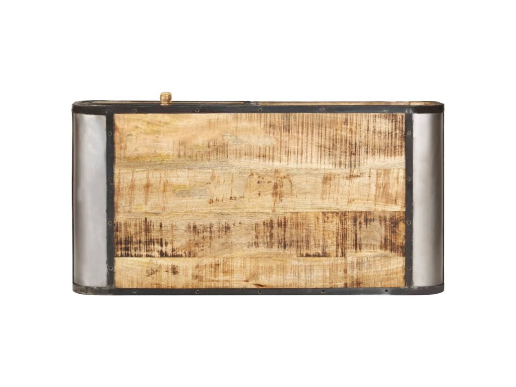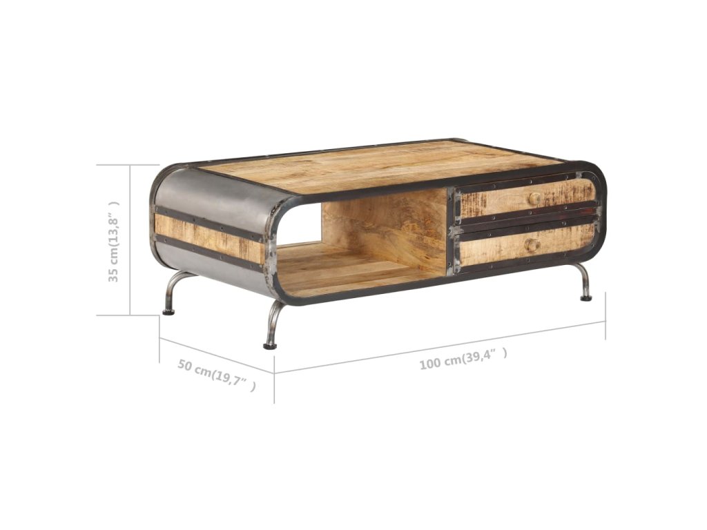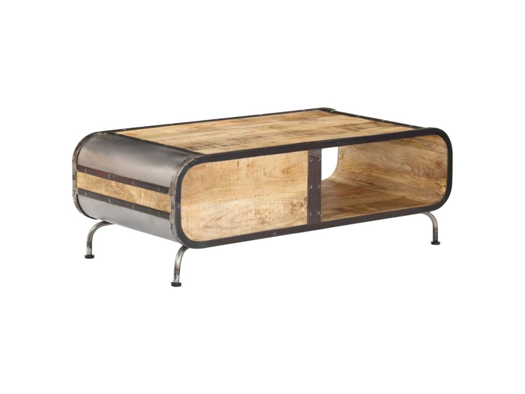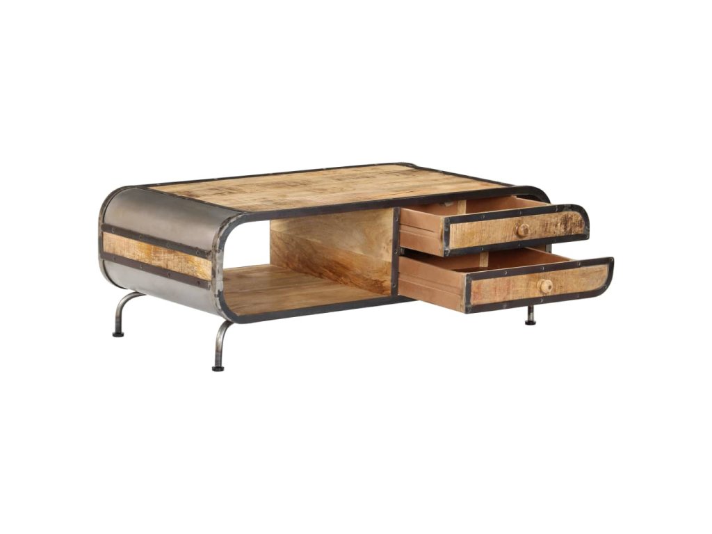 Tento konferenčný stolík je vyrobený z masívneho mangovníkového dreva, tvrdého dreva s hustou štruktúrou. Hrubé mangovníkové drevo sa môže pochváliť nielen pevnosťou, ktorá unesie veľkú hmotnosť, ale aj odolnosťou voči opotrebovaniu. V dôsledku toho je tento krásne navrhnutý drevený konferenčný stolík mimoriadne stabilný, trvácny a pútavý. Tento príručný stolík je ručne vyrobený a vďaka peknej štruktúre dreva je každý kus tohto nábytku jedinečný a mierne odlišný od ostatných kusov. Železný rám prispieva k priemyselnému štýlu stolíka. Tento stolík do obývacej miestnosti má 2 zásuvky a 1 poličku, ktorá poskytuje dostatok priestoru na uloženie vašich multimediálnych zariadení, kníh, ale aj rôznych iných predmetov.