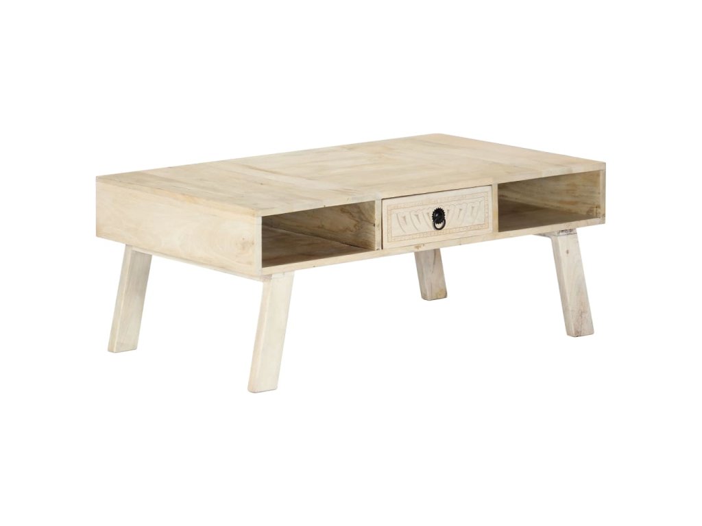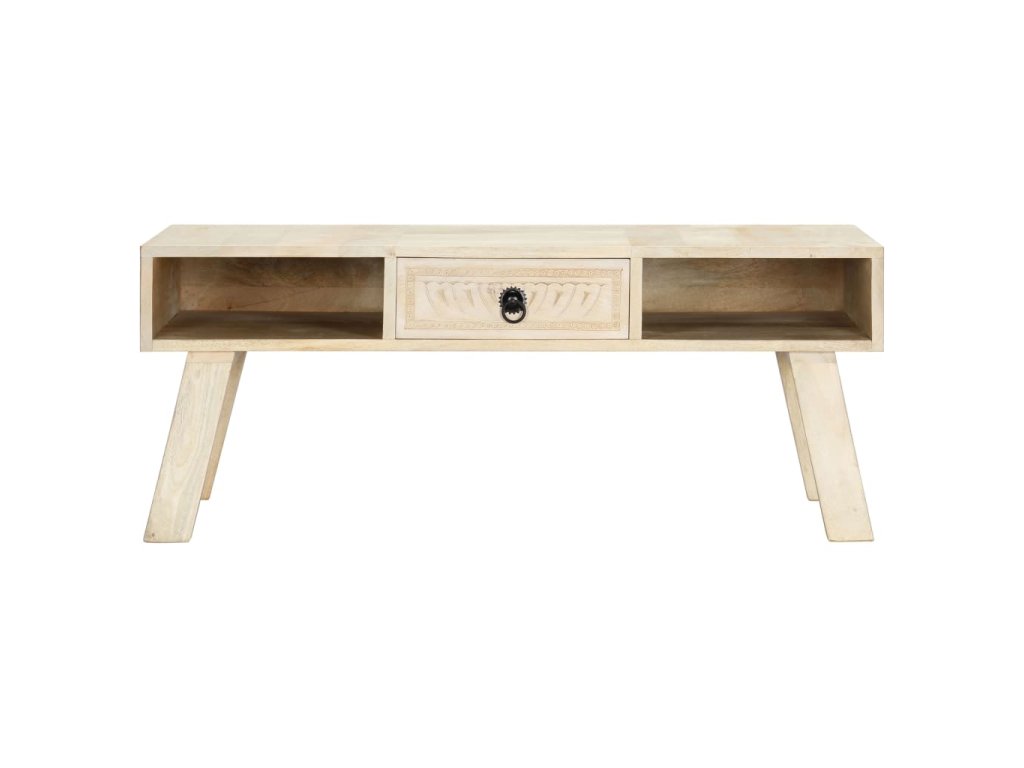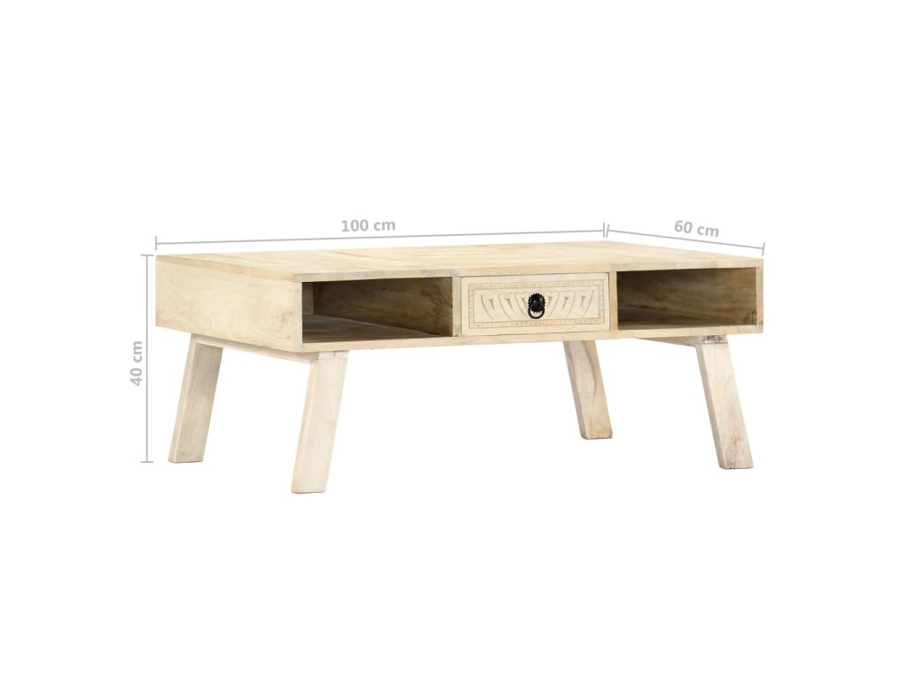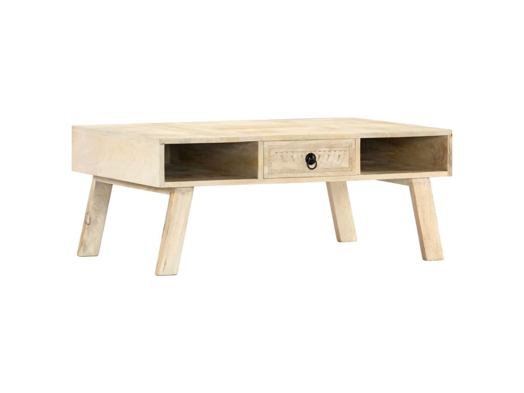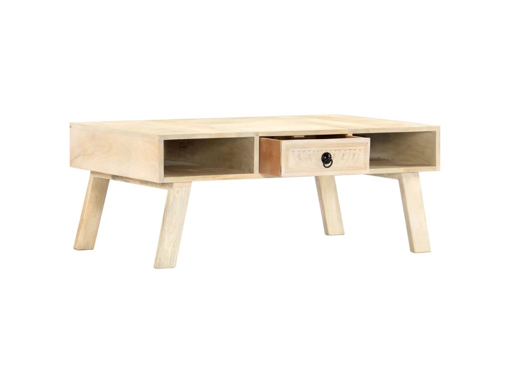 Gaučový stolík je vyrobený z masívneho mangového dreva, čo je tvrdé drevo s hustou štruktúrou. Surové mangovníkové drevo nielenže unesie aj vyššiu hmotnosť, ale odoláva aj opotrebovaniu časom. Každý krok výrobného procesu sa vykonáva s maximálnou starostlivosťou, či už je to leštenie alebo lakovanie. Vďaka vynikajúcemu remeselnému spracovaniu a pôsobivému ručnému vyrezávaniu je každý kus nábytku výnimočný a trochu odlišný od ostatných. Tento stolík do obývačky je vybavený 1 zásuvkou a 2 otvorenými priehradkami, vďaka čomu ponúkne dostatok úložného priestoru na rôzne drobnosti. Stôl sa jednoducho montuje.