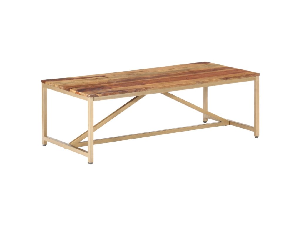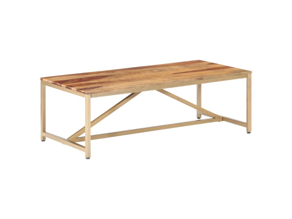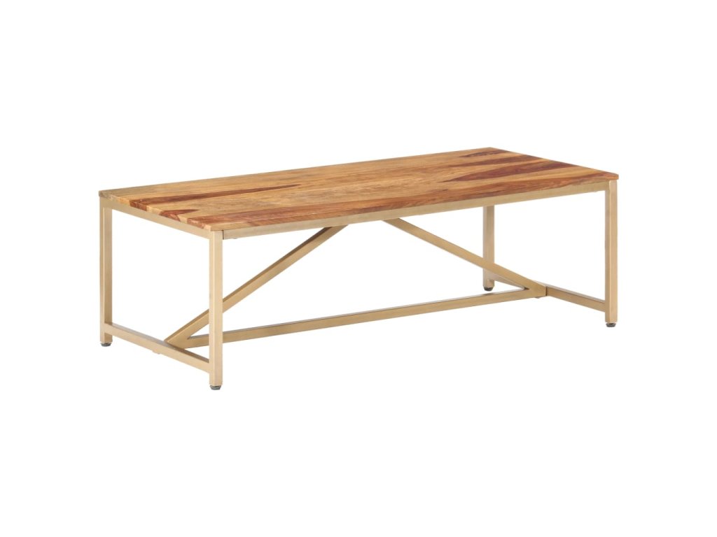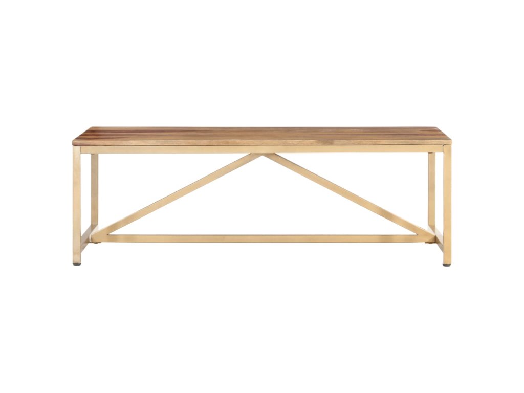 Tento praktický konferenčný stolík je vyrobený z dreveného masívu a môžete ho využívať aj ako príručný stolík, odkladací stolík alebo stolík ku gauču. Vďaka remeselnému opracovaniu a krásnej textúre dreva je každý kus nábytku jedinečný a trochu odlišný od ostatných. Pevná stolová doska poskytuje stabilný a bezpečný povrch, na ktorý si môžete položiť nápoje, vázy, košíky s ovocím a ďalšie dekorácie. Oceľ s mosadznou práškovou povrchovou úpravou mu dodáva potrebnú stabilitu. Tento drevený stôl sa jednoducho montuje.