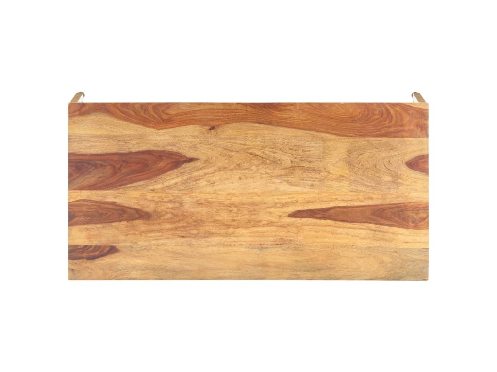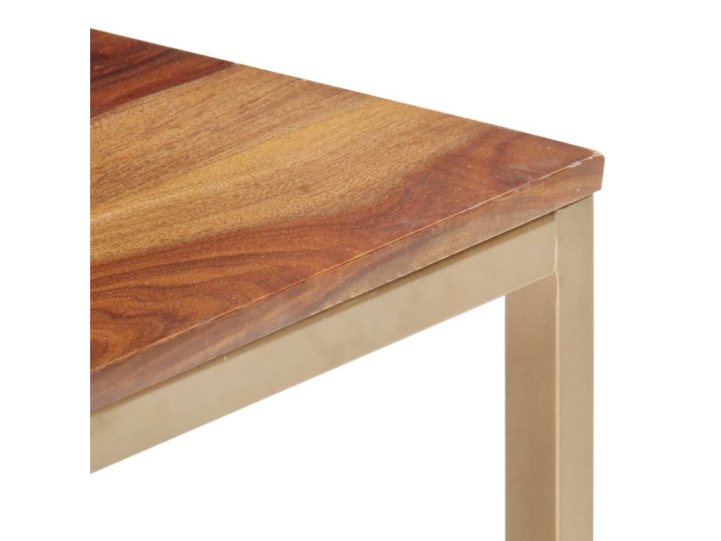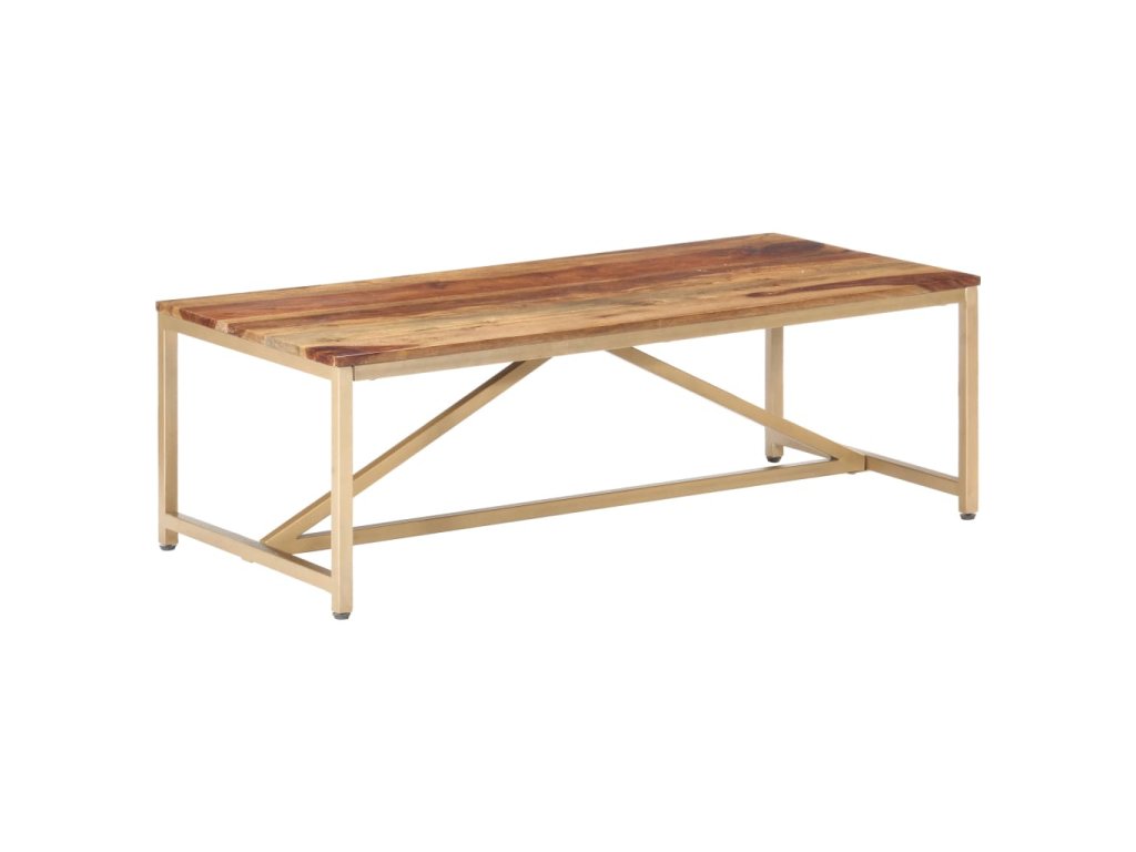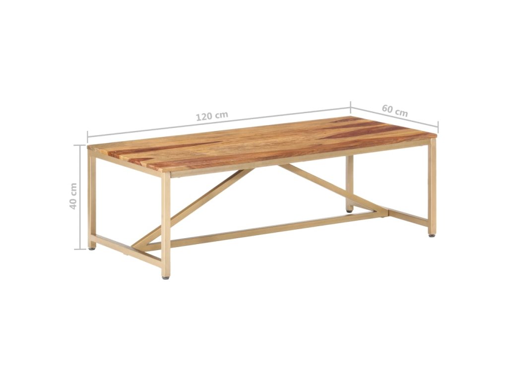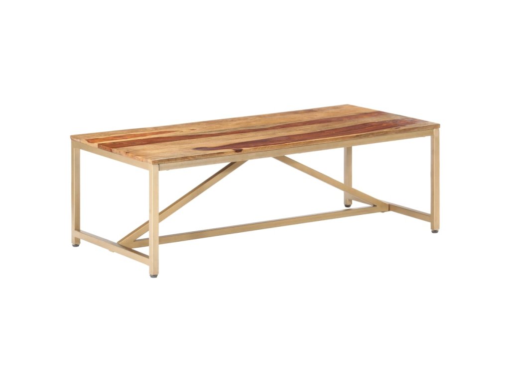 Tento praktický konferenčný stolík je vyrobený z dreveného masívu a môžete ho využívať aj ako príručný stolík, odkladací stolík alebo stolík ku gauču. Vďaka remeselnému opracovaniu a krásnej textúre dreva je každý kus nábytku jedinečný a trochu odlišný od ostatných. Pevná stolová doska poskytuje stabilný a bezpečný povrch, na ktorý si môžete položiť nápoje, vázy, košíky s ovocím a ďalšie dekorácie. Oceľ s mosadznou práškovou povrchovou úpravou mu dodáva potrebnú stabilitu. Tento drevený stôl sa jednoducho montuje.