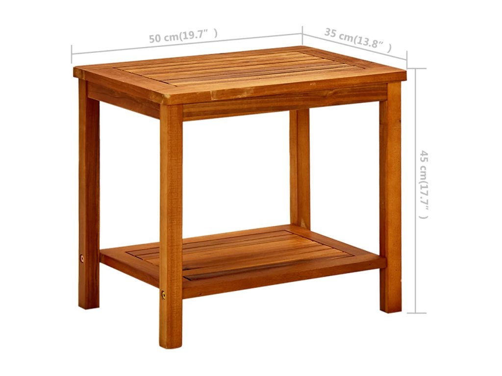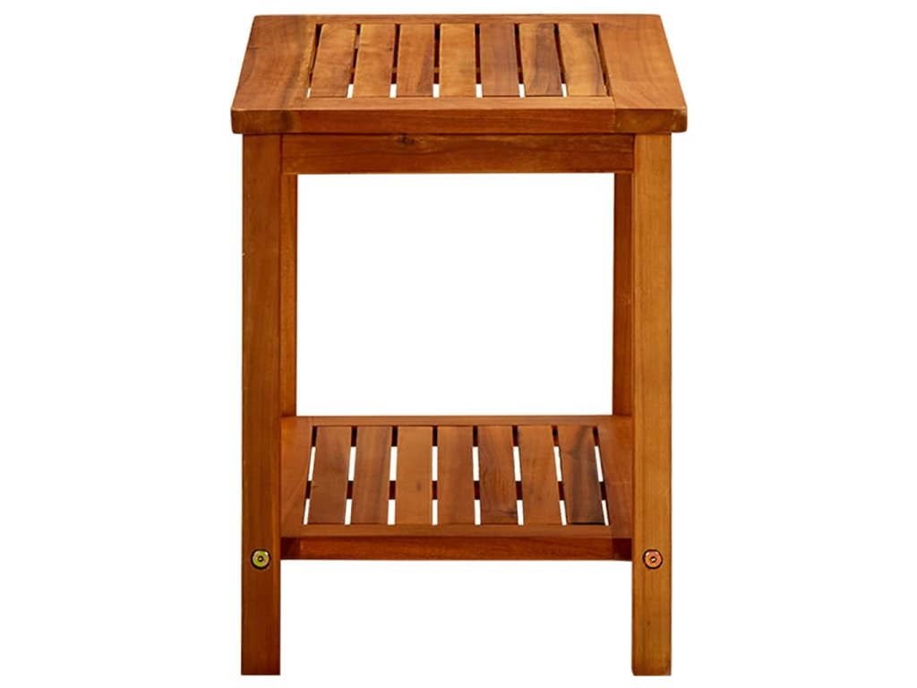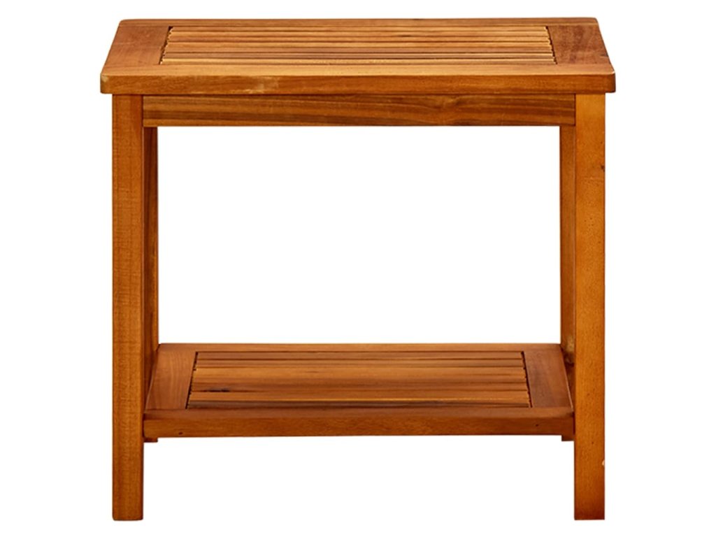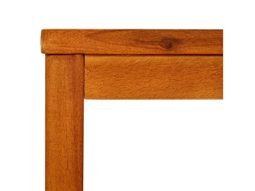 Tento stôl je vyrobený z masívneho akáciového dreva s olejovou povrchovou úpravou, ktorá je odolná voči poveternostným vplyvom a trvácna. Každý krok procesu výroby sa vykonáva s maximálnou starostlivosťou, či už ide o leštenie alebo lakovanie. Robustná stolová doska s lamelovou konštrukciou vám ponúka priestor na odloženie občerstvenia, košíkov s ovocím, dekoračných predmetov, ako aj iných potrieb. Výrazný stolík je vybavený aj spodnou poličkou, ktorá poskytuje ďalší priestor na uloženie vašich základných potrieb na dosah ruky.