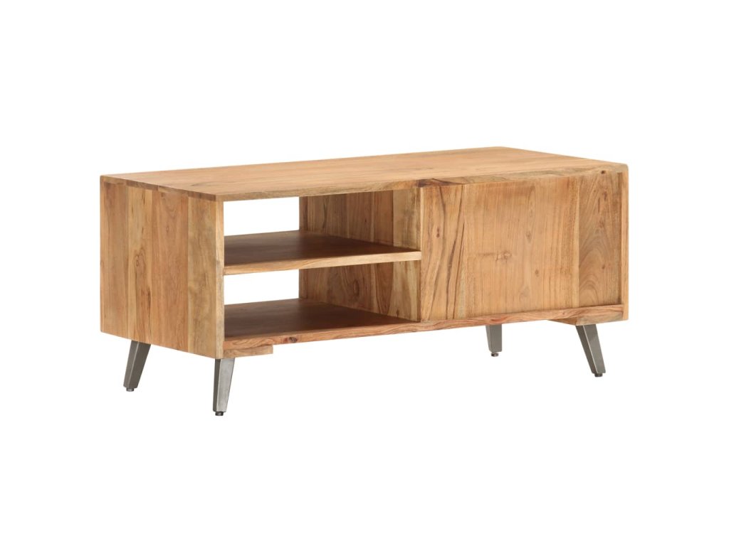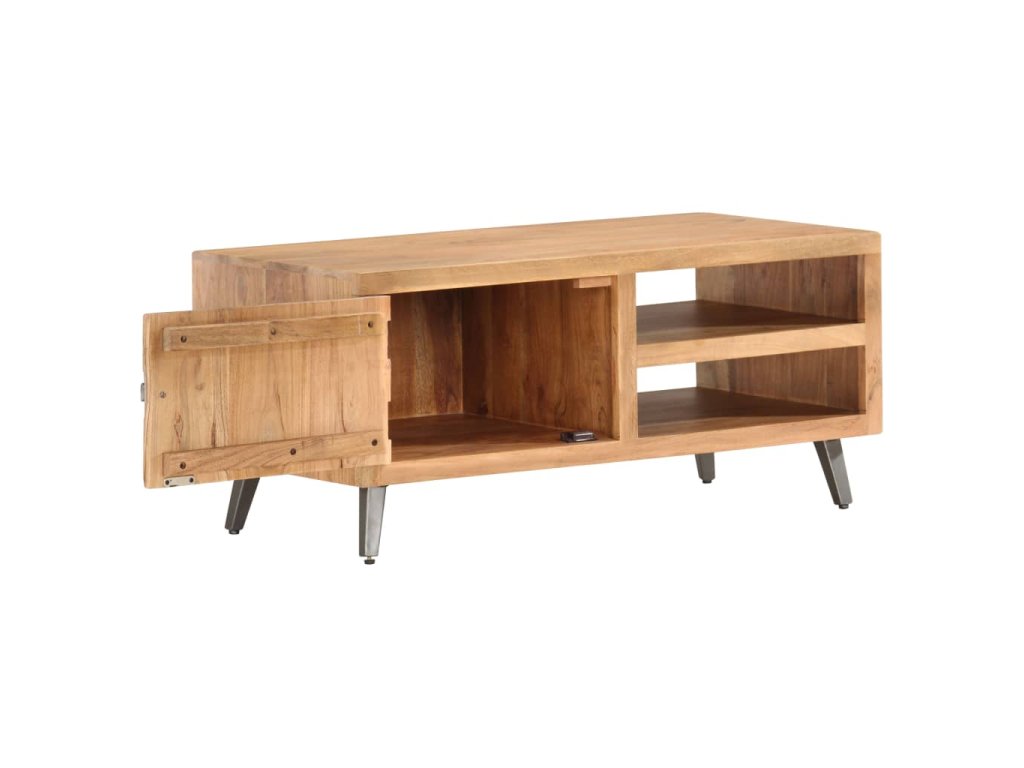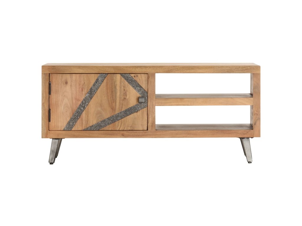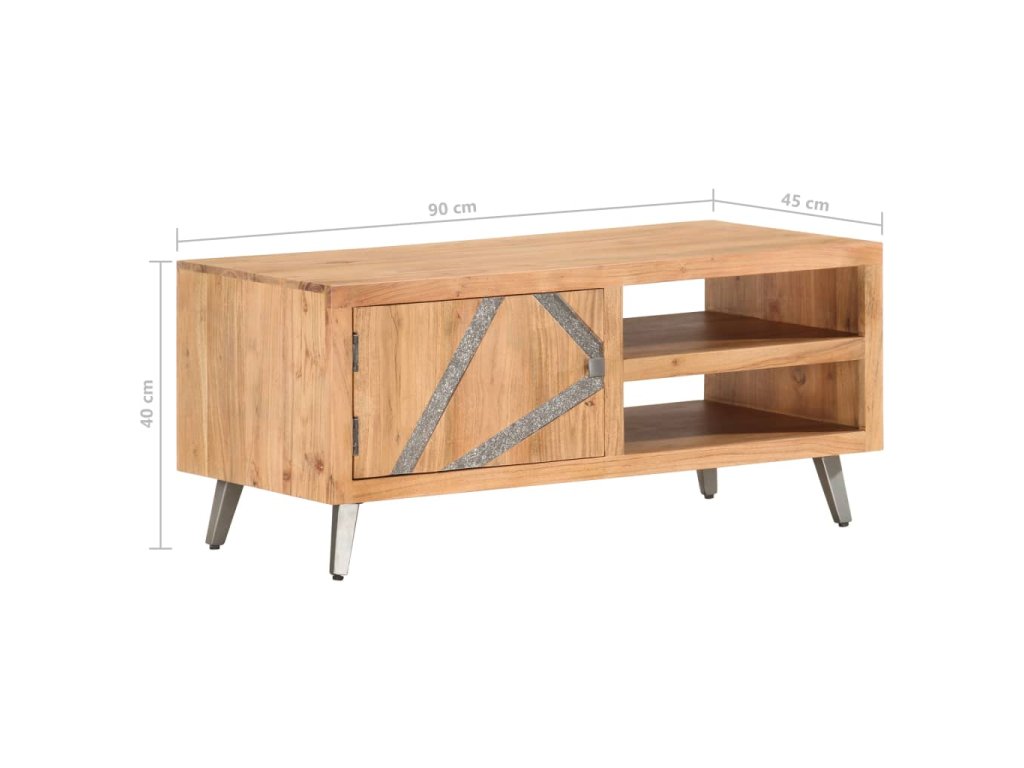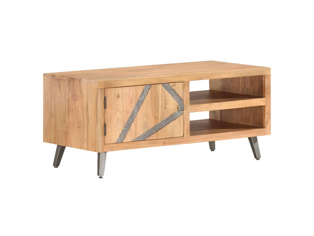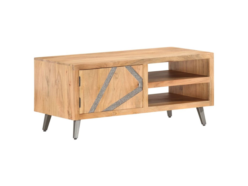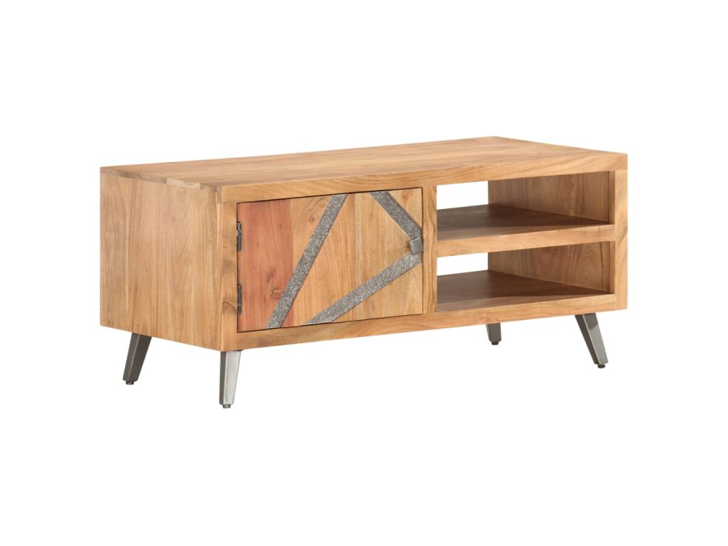 Konferenčný stolík s pruhmi v prednej časti vykladanými kameňmi, je vyrobený z akáciového dreva, ktoré je pevné, trvácne a krásne. Vďaka vynikajúcemu remeselnému opracovaniu a krásnej textúre dreva je každý kus nábytku výnimočný a trochu odlišný od ostatných. Každý krok procesu výroby je vykonávaný s tou najväčšou starostlivosťou, vrátane leštenia, natierania a lakovania. Oceľové nohy s práškovým nástrekom dodávajú komode industriálny štýl. Okrem toho má tento gaučový stolík 2 priehradky a 1 dvierka, ktoré poskytujú dostatok priestoru na uloženie všetkých druhov menších predmetov, ktoré sú organizované a na dosah ruky. Výrobok sa jednoducho montuje.