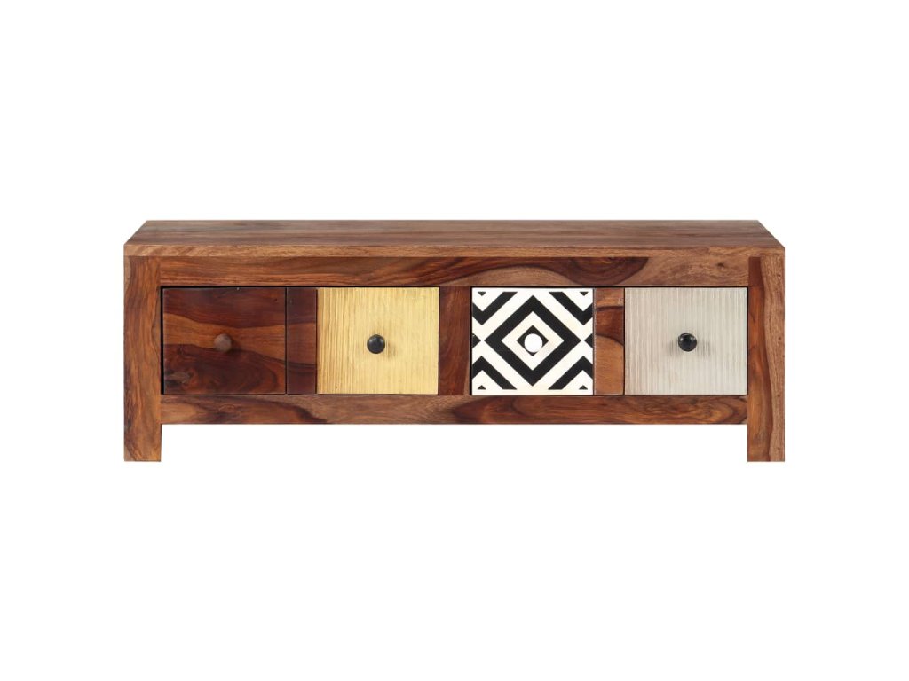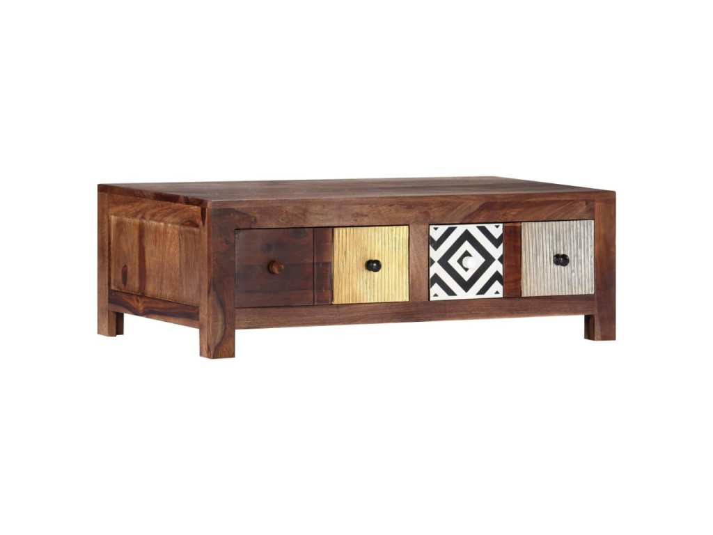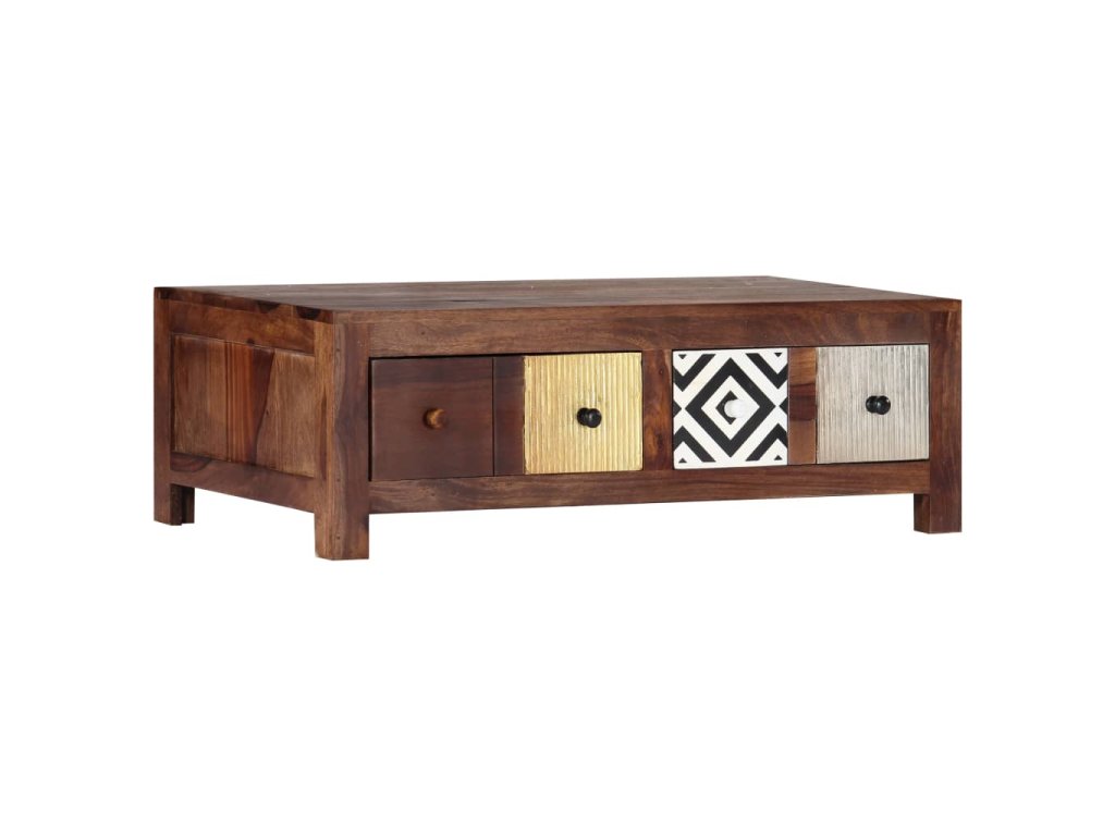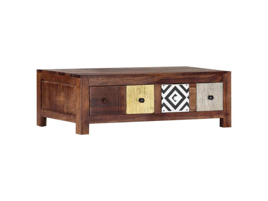 Tento konferenčný stolík je vyrobený z masívneho akáciového dreva. Akácia, tiež známy ako ružové drevo alebo palisander, je tropické tvrdé drevo, ktoré je známe svojou bohatou kresbou. Tento stôl má stabilný a bezpečný vrch na umiestnenie nápojov, ovocných košov, ozdobných predmetov atď. Masívne akáciové drevo dostalo krásny povrch leštením, natieraním a lakovaním, vďaka čomu z neho vyžaruje rafinovaný vzhľad. Dve veľké zásuvky, ktorých predné dvere sú zdobené rôznymi vzormi, jedna so strieborným a druhá so akáciaovým a zlatým vzorom, poskytujú dostatočný priestor na umiestnenie väčších domácich potrieb. Konferenčný stolík sa dá navyše použiť aj ako stolík ku gauču, stolík do obývacej izby, príručný stolík atď.