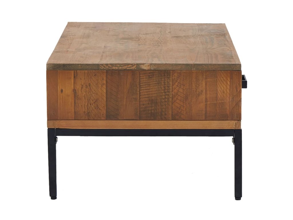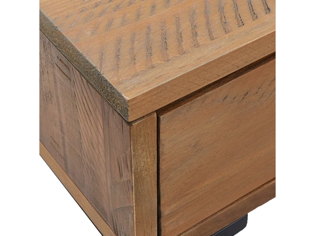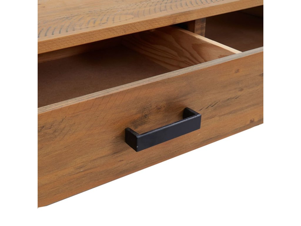 - Borovicový masív: Príručný stolík je vyrobený z borovicového masívu, na ktorom sa nachádzajú drsné hrany, nedostatky a škrabance, čo mu dodáva vintage industriálny vzhľad.