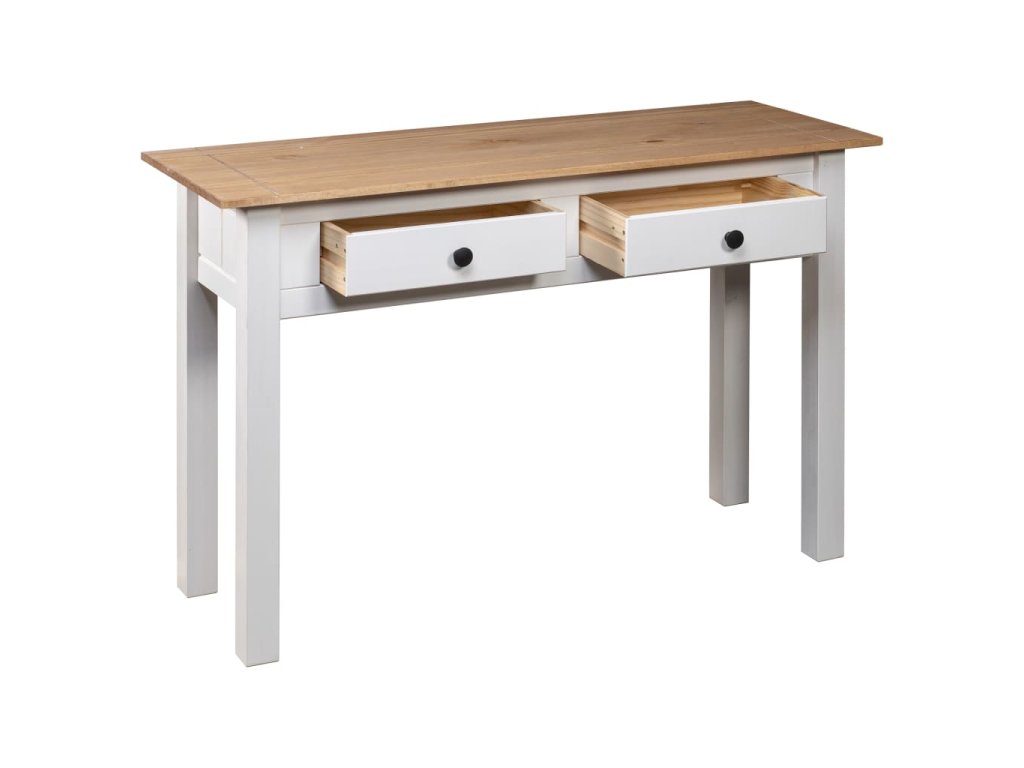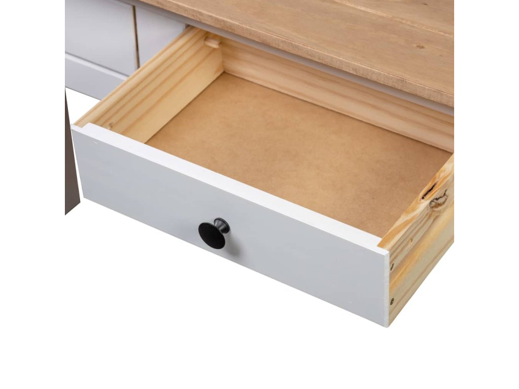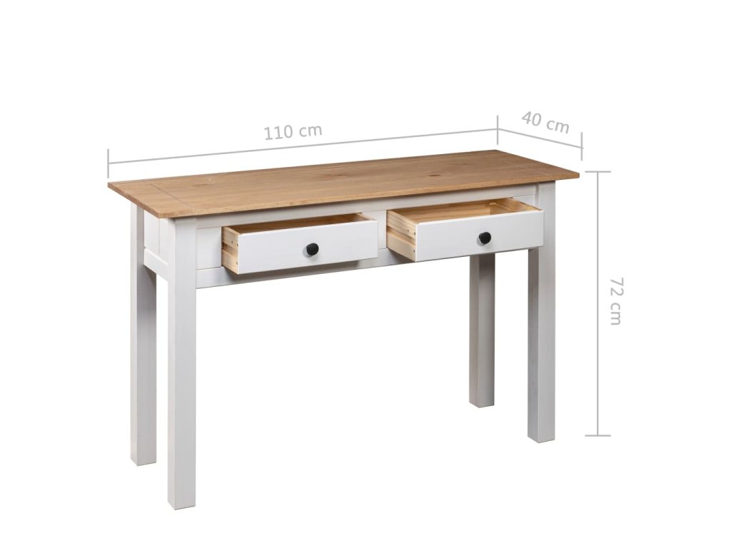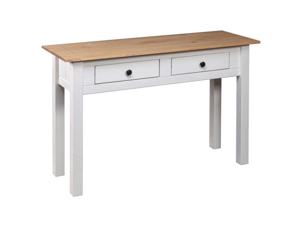 Konzolový stolík bol odborne vyhotovený z borovicového masívu, a preto je veľmi pevný a trvácny. Vďaka kompaktnému dizajnu ho môžete umiestniť takmer kamkoľvek. Pevná doska stola je ako stvorená na vystavenie rôznych dekoratívnych predmetov, rámikov s fotkami alebo kvetov v kvetináčoch. 2 zásuvky poskytujú dodatočný priestor na odkladanie menších predmetov.