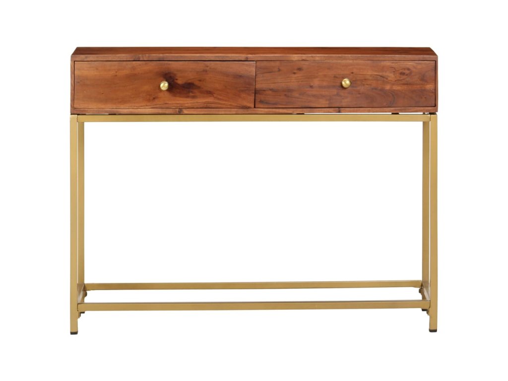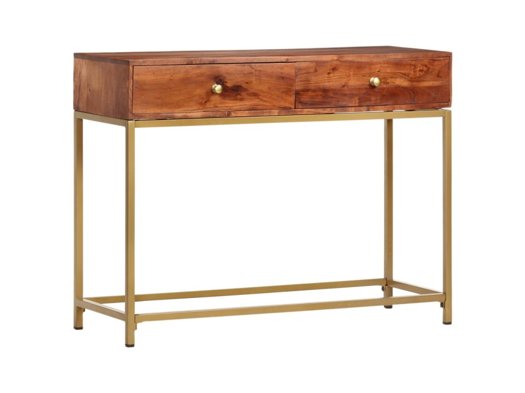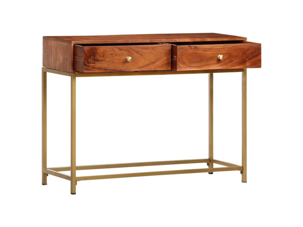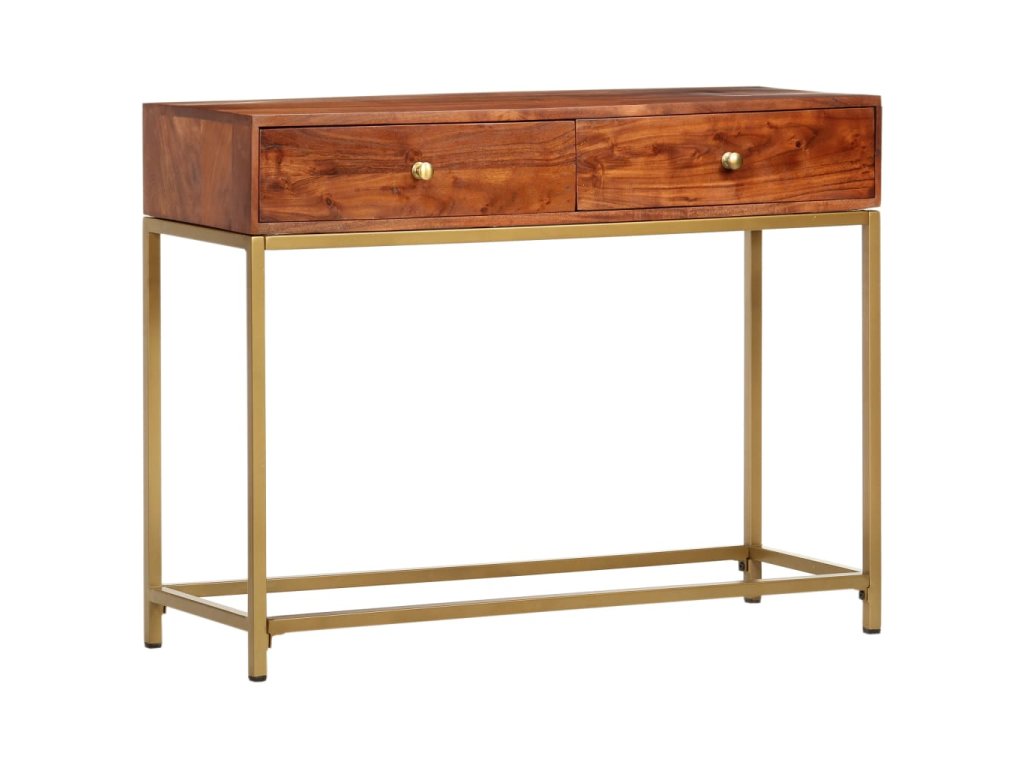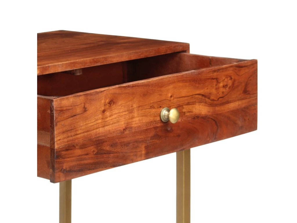 Stolík je vyrobený z masívneho akáciového dreva, ktoré bolo krásne upravené leštením, natieraním a lakovaním, aby malo rafinovaný vzhľad. Stolík je ručne vyrobený a vďaka krásnej štruktúre dreva je každý kus nábytku jedinečný a mierne sa odlišuje od iných kusov. Jeho pevnosť zaisťujú železné nohy s mosadzným práškovým povrchom. Má odolný vrch, na ktorý môžete umiestniť ovocný kôš, vázu alebo iné ozdobné predmety. Dve zásuvky s ľahkým vysúvaním sa dajú použiť na uloženie predmetov, ako sú časopisy, poznámkové bloky, knihy a ďalšie drobnosti.