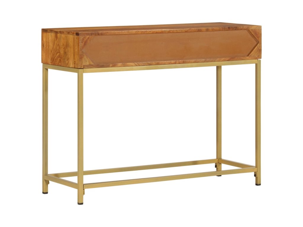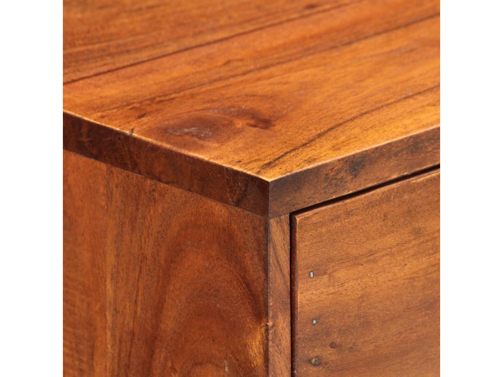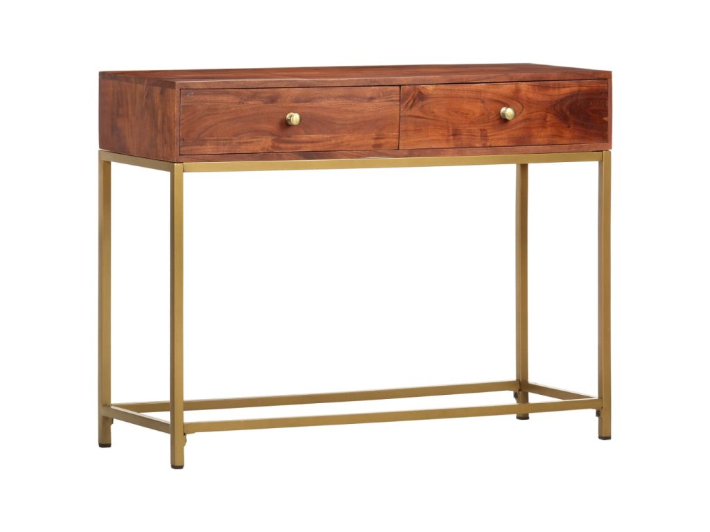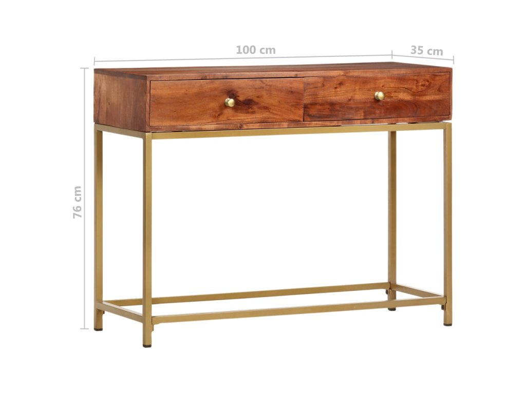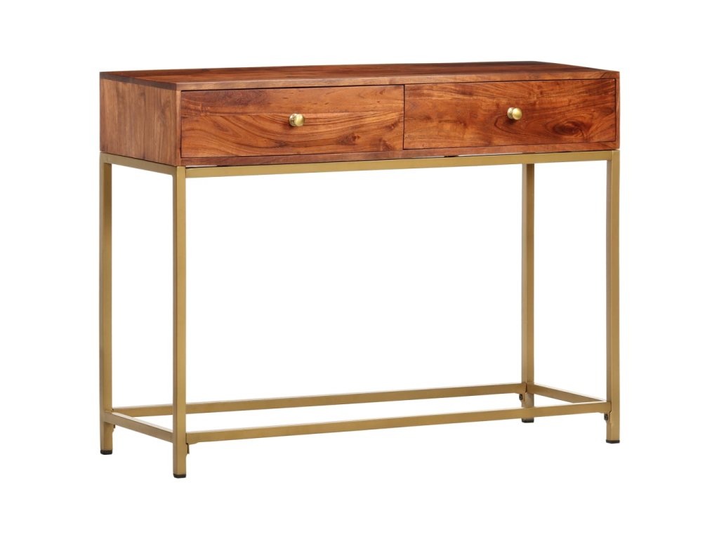 Stolík je vyrobený z masívneho akáciového dreva, ktoré bolo krásne upravené leštením, natieraním a lakovaním, aby malo rafinovaný vzhľad. Stolík je ručne vyrobený a vďaka krásnej štruktúre dreva je každý kus nábytku jedinečný a mierne sa odlišuje od iných kusov. Jeho pevnosť zaisťujú železné nohy s mosadzným práškovým povrchom. Má odolný vrch, na ktorý môžete umiestniť ovocný kôš, vázu alebo iné ozdobné predmety. Dve zásuvky s ľahkým vysúvaním sa dajú použiť na uloženie predmetov, ako sú časopisy, poznámkové bloky, knihy a ďalšie drobnosti.