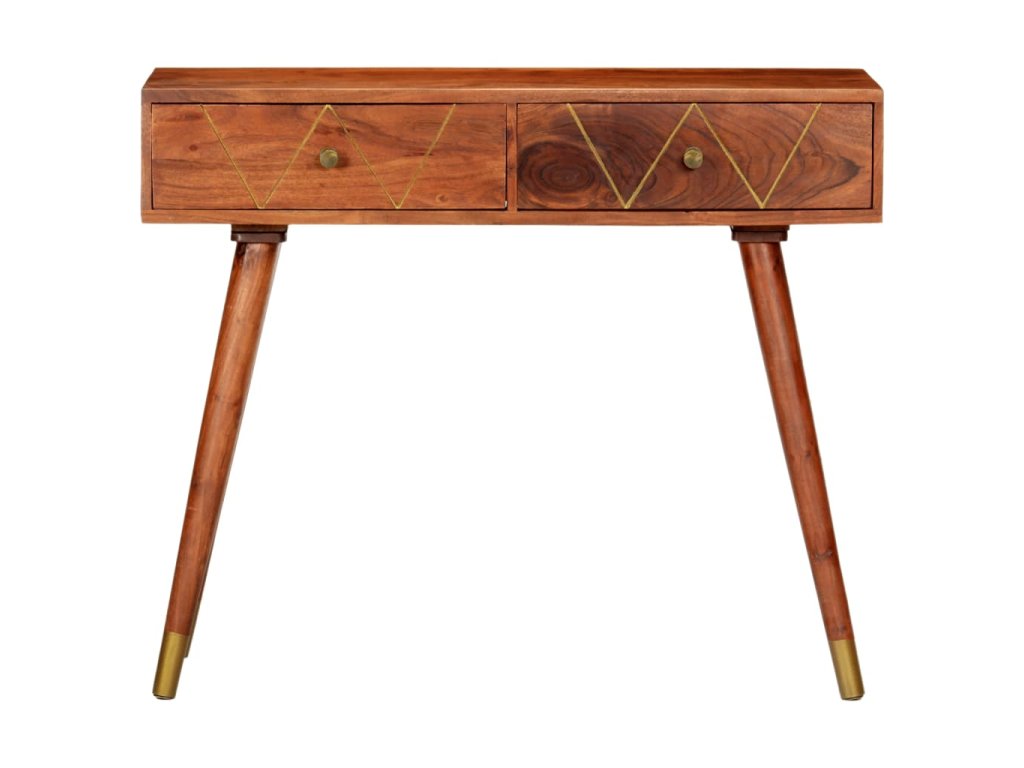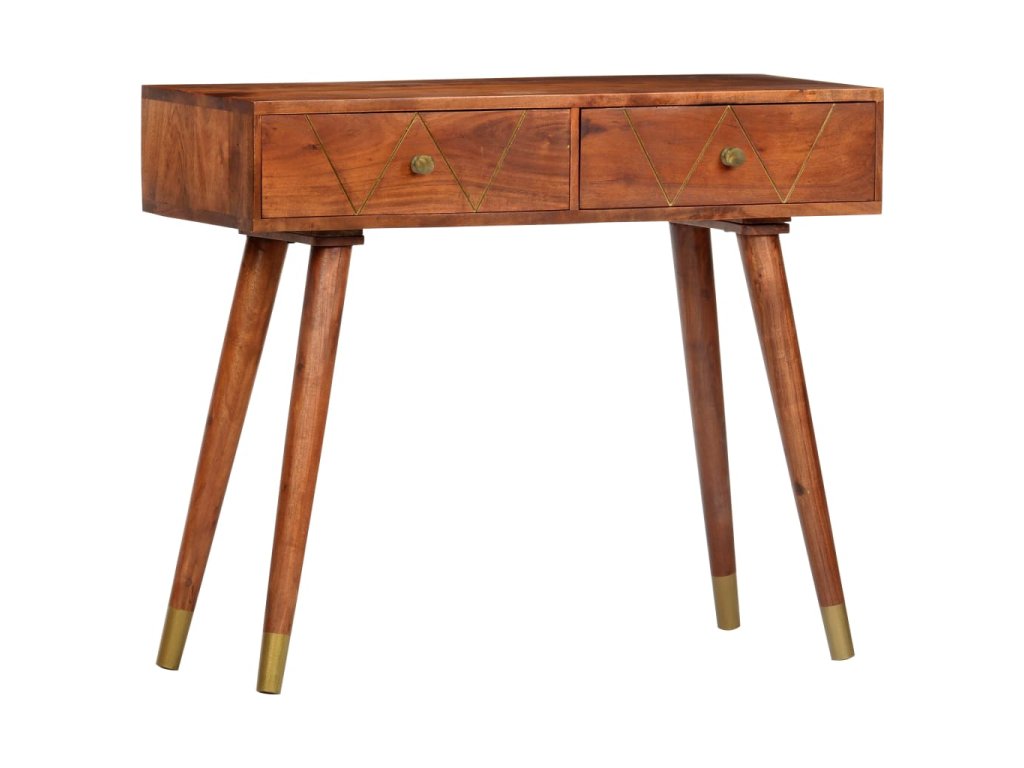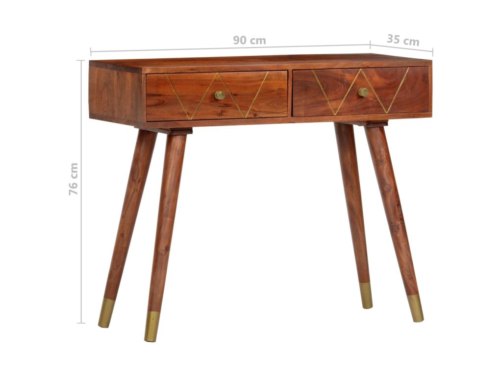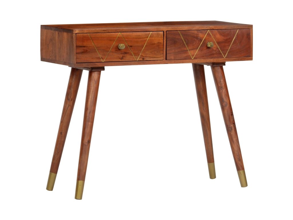 Stolík je vyrobený z masívneho akáciového dreva, ktoré bolo krásne upravené leštením, natieraním a lakovaním, čo mu dodáva rafinovaný vzhľad. Stolík bol ručne vyrobený a vďaka krásnej drevenej štruktúre je každý kus nábytku jedinečný a mierne sa odlišuje od iných kusov. Robustná stolová doska je ideálna na vystavenie dekoratívnych predmetov, fotorámikov alebo kvetináčov. Na uloženie malých predmetov, ako sú kľúče, poznámkové bloky, perá a ďalšie drobnosti, slúžia dve zásuvky s hladkým vysúvaním. Môže sa použiť aj ako stôl, bočný stolík, príručná skrinka atď. Ľahko sa čistí a udržiava vlhkou handričkou.