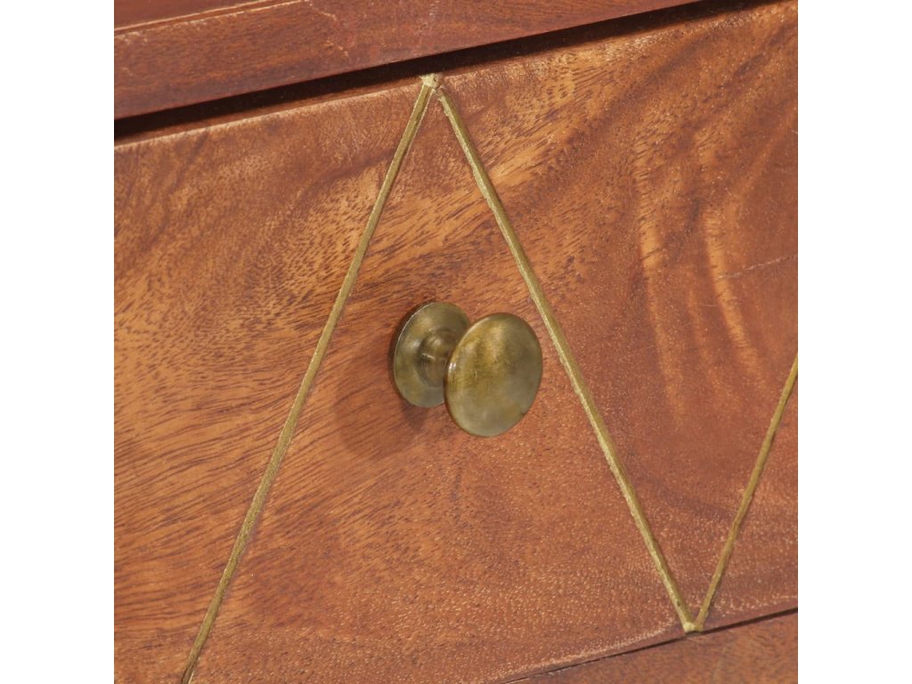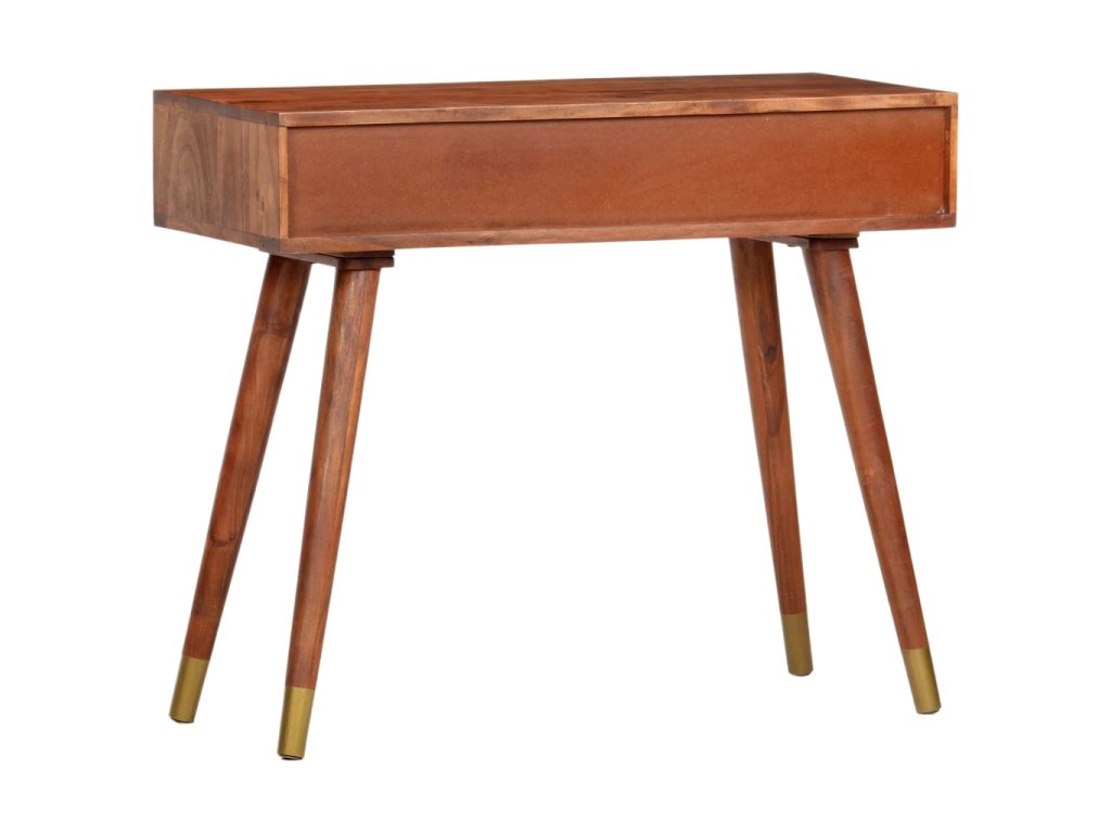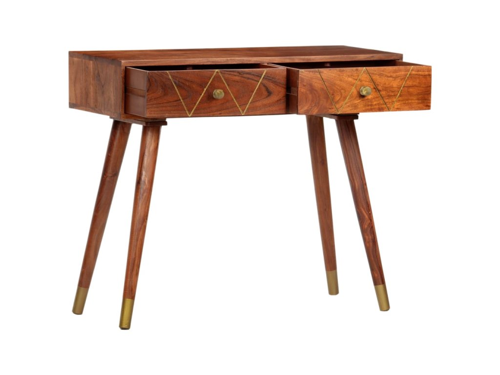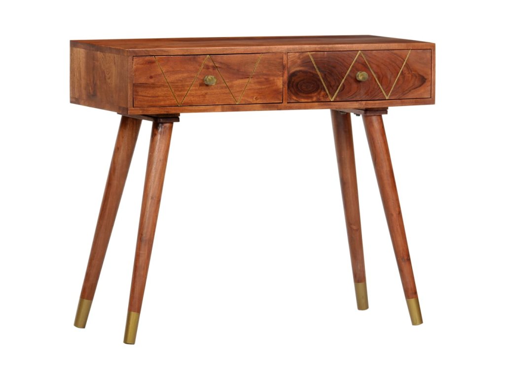 Stolík je vyrobený z masívneho akáciového dreva, ktoré bolo krásne upravené leštením, natieraním a lakovaním, čo mu dodáva rafinovaný vzhľad. Stolík bol ručne vyrobený a vďaka krásnej drevenej štruktúre je každý kus nábytku jedinečný a mierne sa odlišuje od iných kusov. Robustná stolová doska je ideálna na vystavenie dekoratívnych predmetov, fotorámikov alebo kvetináčov. Na uloženie malých predmetov, ako sú kľúče, poznámkové bloky, perá a ďalšie drobnosti, slúžia dve zásuvky s hladkým vysúvaním. Môže sa použiť aj ako stôl, bočný stolík, príručná skrinka atď. Ľahko sa čistí a udržiava vlhkou handričkou.