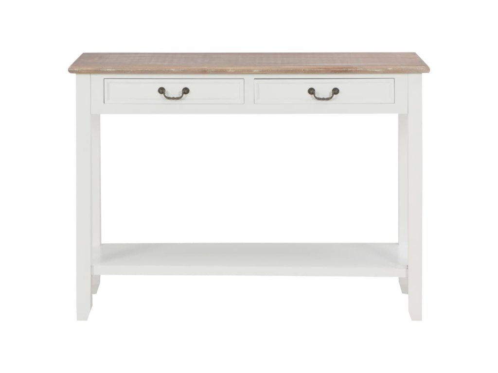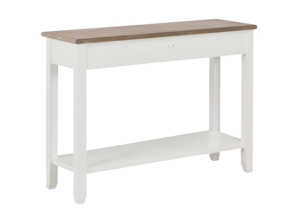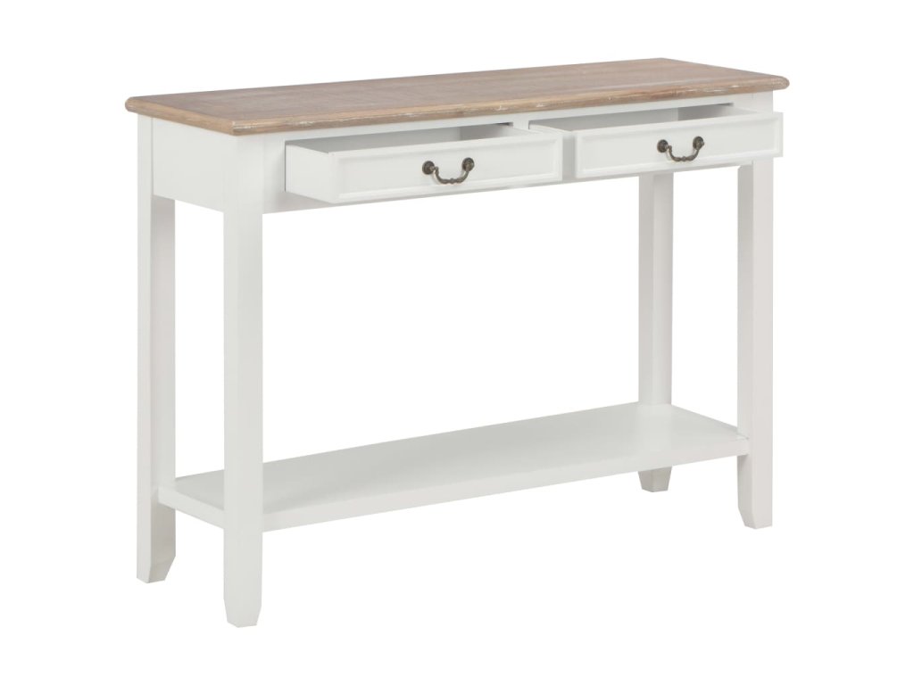 Stolík má pevnú dosku z MDF, na ktorú môžete umiestniť dekoratívne predmety, ako sú ovocné koše alebo vázy. Nohy z masívneho borovicového dreva zaručujú stabilitu a trvácnosť a zaisťujú dlhé roky používania. Má 2 zásuvky, ktoré poskytujú dostatok priestoru na uloženie všetkých menších predmetov, ktoré potrebujete mať na dosah ruky. Polička vytvára dodatočný priestor napríklad na uloženie obuvi a iných položiek.