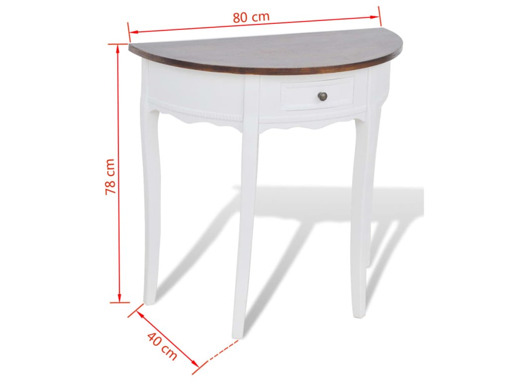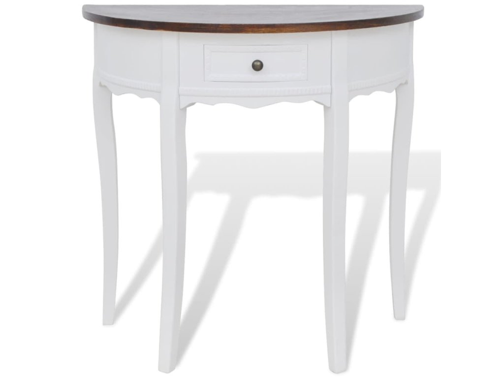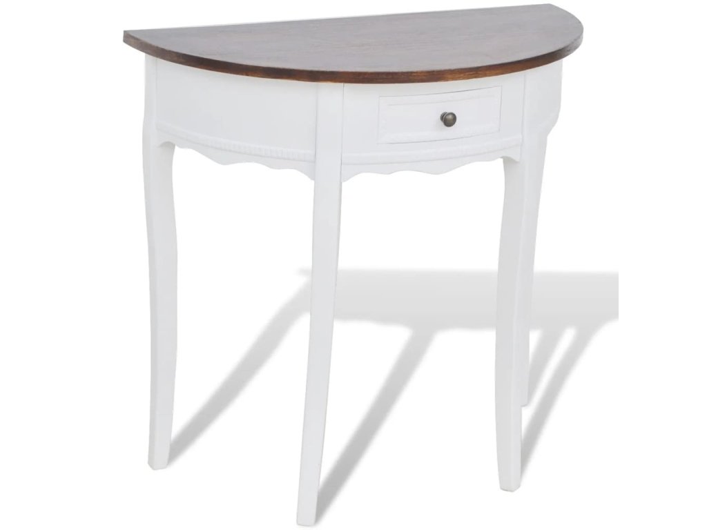 Tento trvácny konzolový stolík je vyrobený z vysokokvalitného MDF a borovicového dreva a má bielu povrchovú úpravu. Hnedá vrchná doska mu dodáva vidiecky vzhľad.