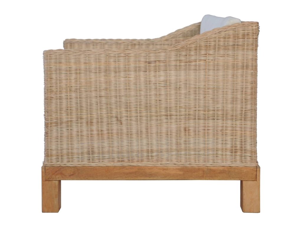 Vďaka pravému ratanovému materiálu sa toto kreslo jednoducho čistí, je odolné a vhodné pre každodenné použitie. Má pevný drevený rám, ktorý je trvácny a stabilný. Hrubé podsedáky a vankúše sú pohodlné a vďaka odnímateľným návliečkam sa dajú aj prať.