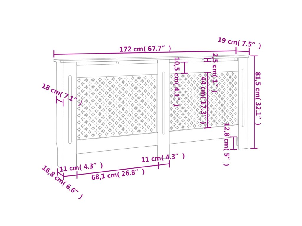 Pevná a odolná skrinka na radiátor je vyrobená z MDF s lakovaním na báze vody. Skrinka na radiátor má moderný roštový dizajn, ktorý sa bude hodiť do akéhokoľvek interiéru.