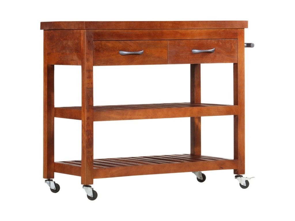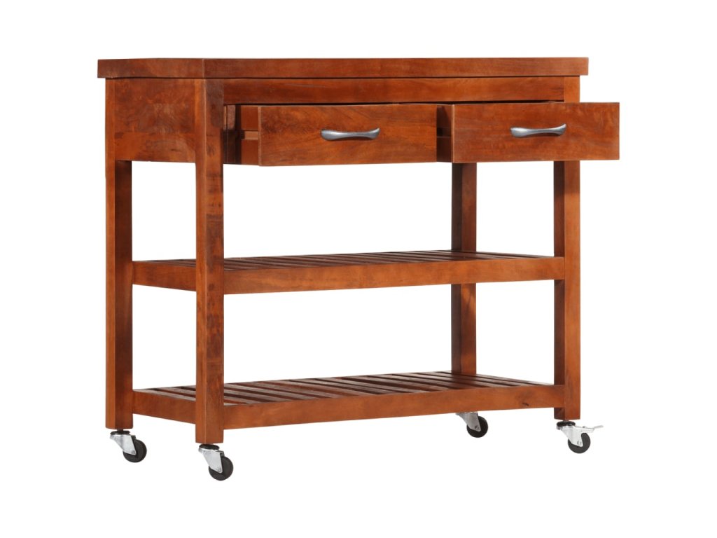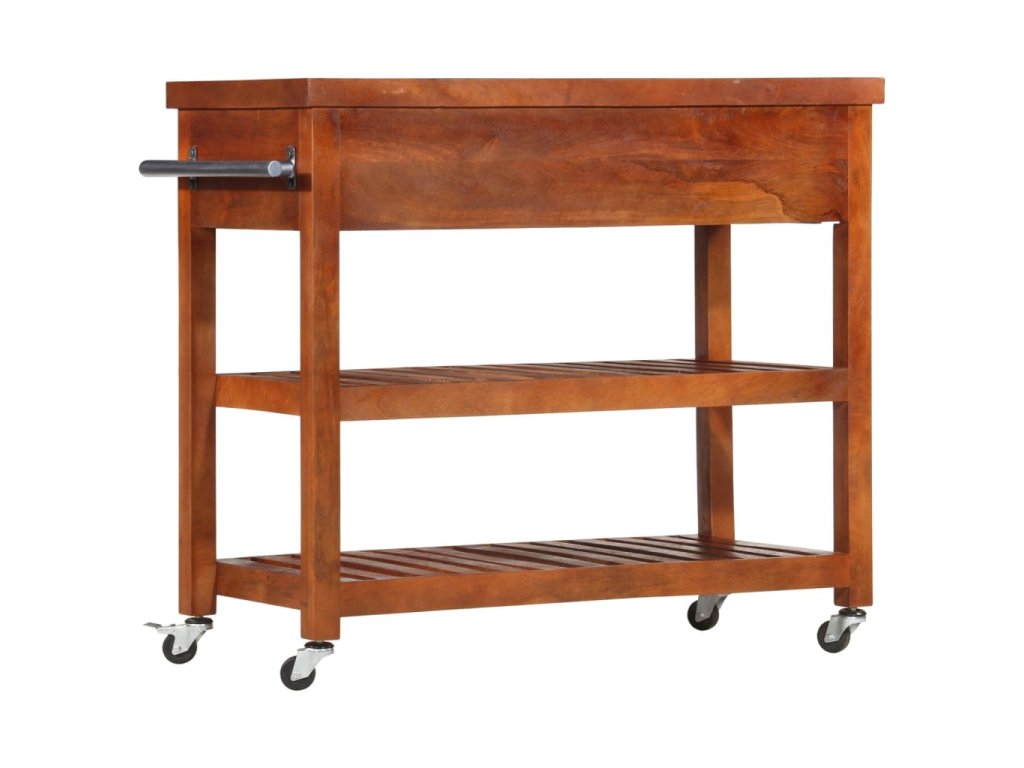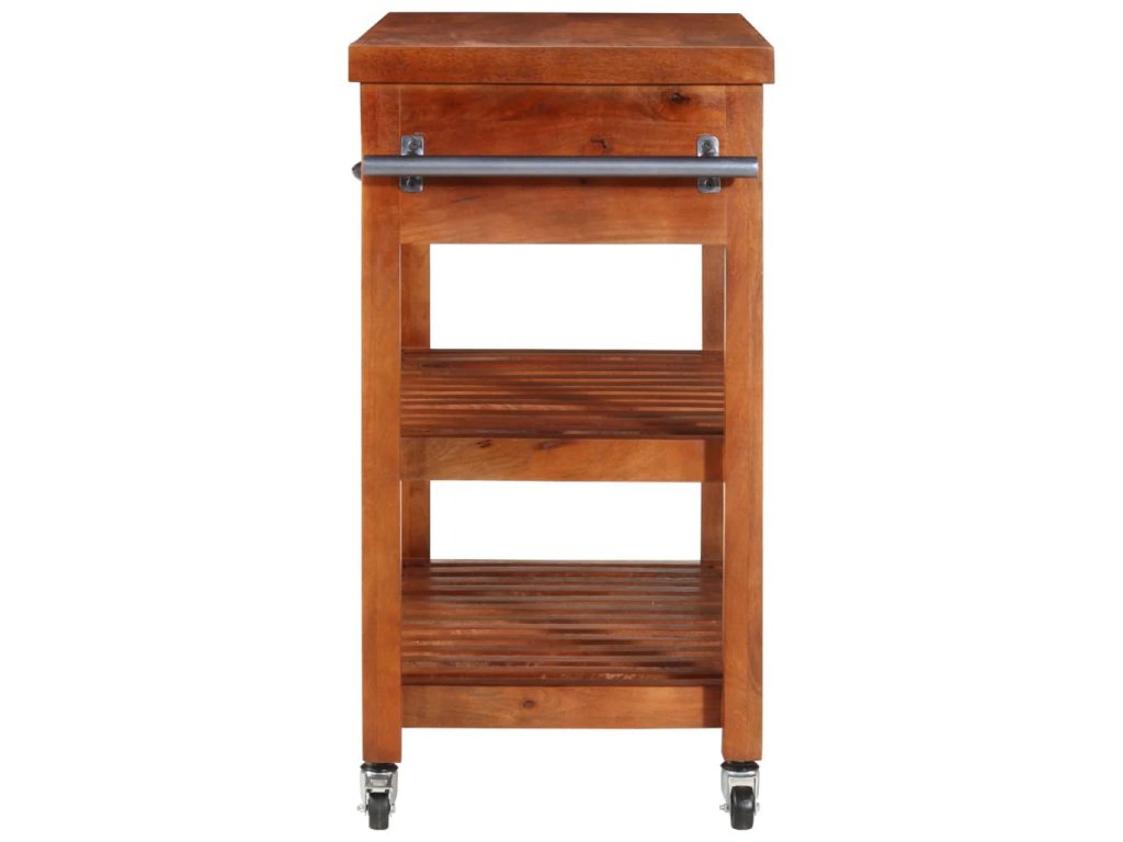 Tento vozík je mimoriadne stabilný a trvácny, pretože je vyrobený z akáciového dreva, čo je pevné tvrdé drevo s prirodzenou povrchovou úpravou.Vozík je pre plynulý pohyb vybavený 4 kolieskami, z ktorých 1 je uzamykateľné.Vozík sa dá kedykoľvek premiestniť, uzamknúť a bezpečne odložiť. Zásuvky a spodné police ponúkajú úložný priestor na umiestnenie stojana na fľaše, kuchárskych kníh a iných kuchynských potrieb. Na stojan na bočnej strane vozíka môžete zavesiť utierky.