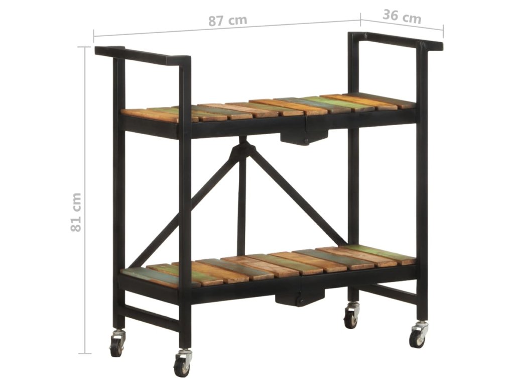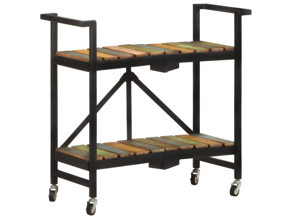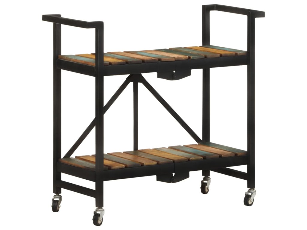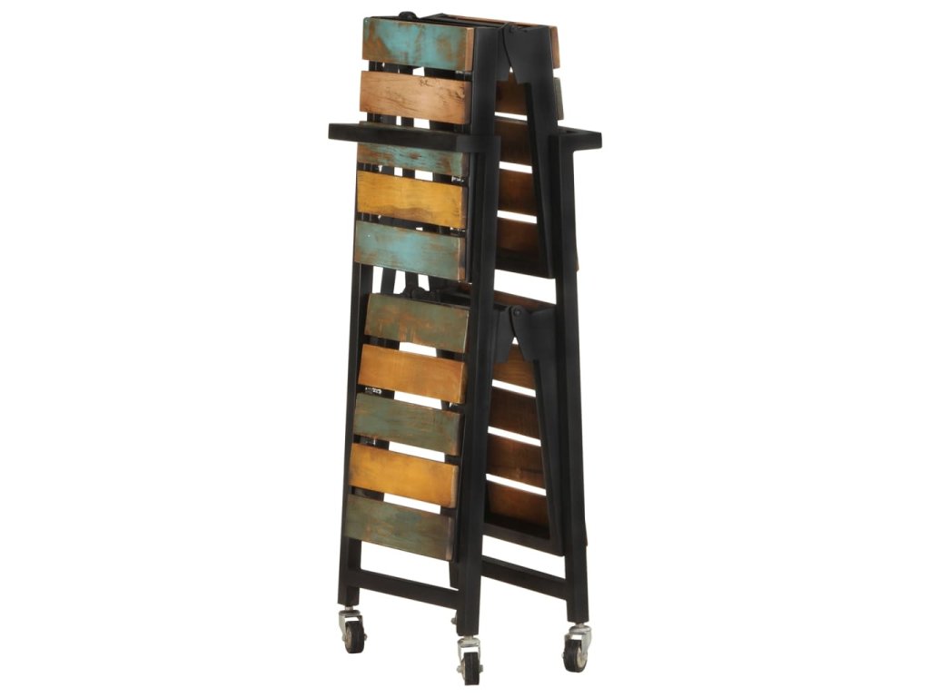 Kuchynský vozík je vyrobený z recyklovaného masívu, ktorý pochádza z trámov, podláh a nosníkov zo starých zbúraných stavieb a pozostáva z rôznych typov dreva, ako napríklad tíkového, tvrdého, tropického či mangovníkového dreva. Recyklované drevo sa preto vyznačuje vlastnosťami týchto typov dreva. Recyklované drevo je staré, zvetrané a usušené, a preto sa nezmršťuje ani neohýba. Pevnosť dodáva aj oceľový rám s práškovým nástrekom. Tento skladovací vozík má 2 priehradky na uloženie potravín, fliaš a ďalších potrieb na dosah ruky. Vďaka skladaciemu designu je možné policový vozík ľahko uložiť, keď sa nepoužíva. Kuchynská polica je navyše vybavená flexibilnými kolieskami pre ľahké posúvanie.
