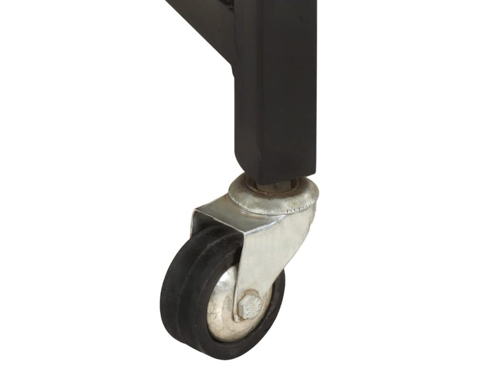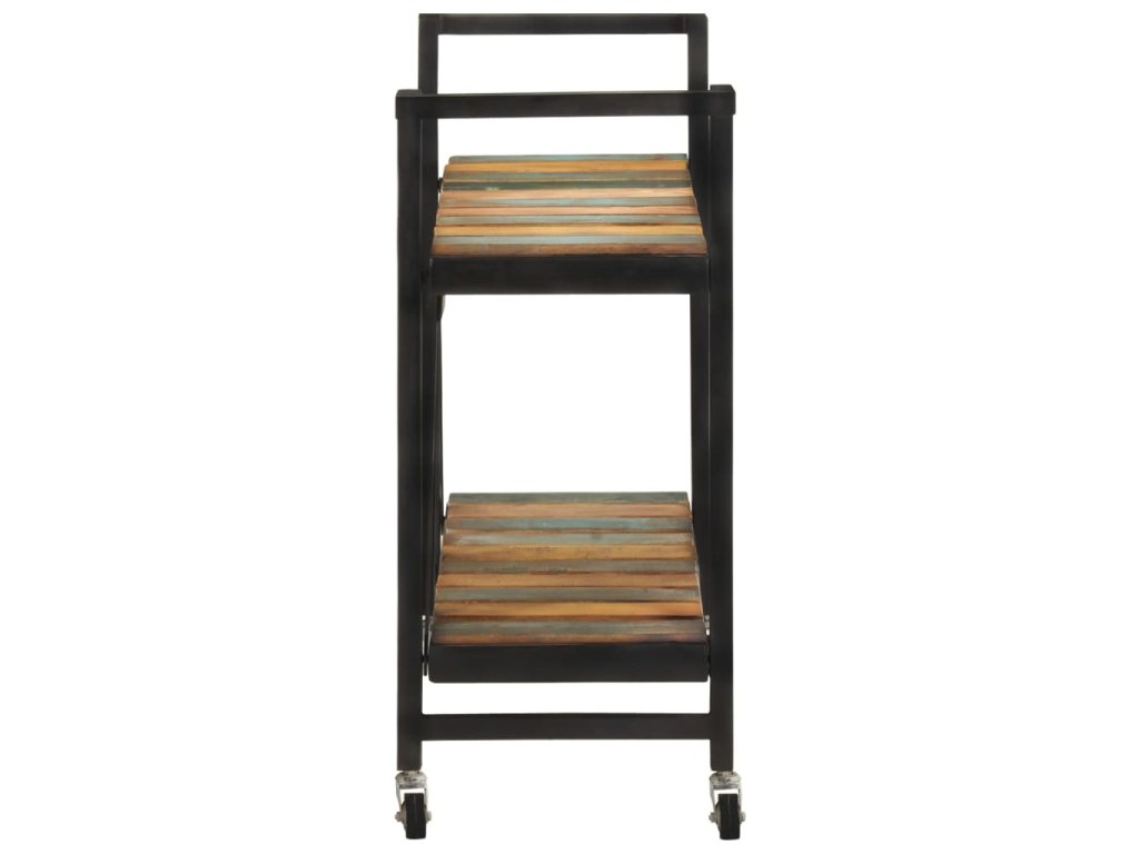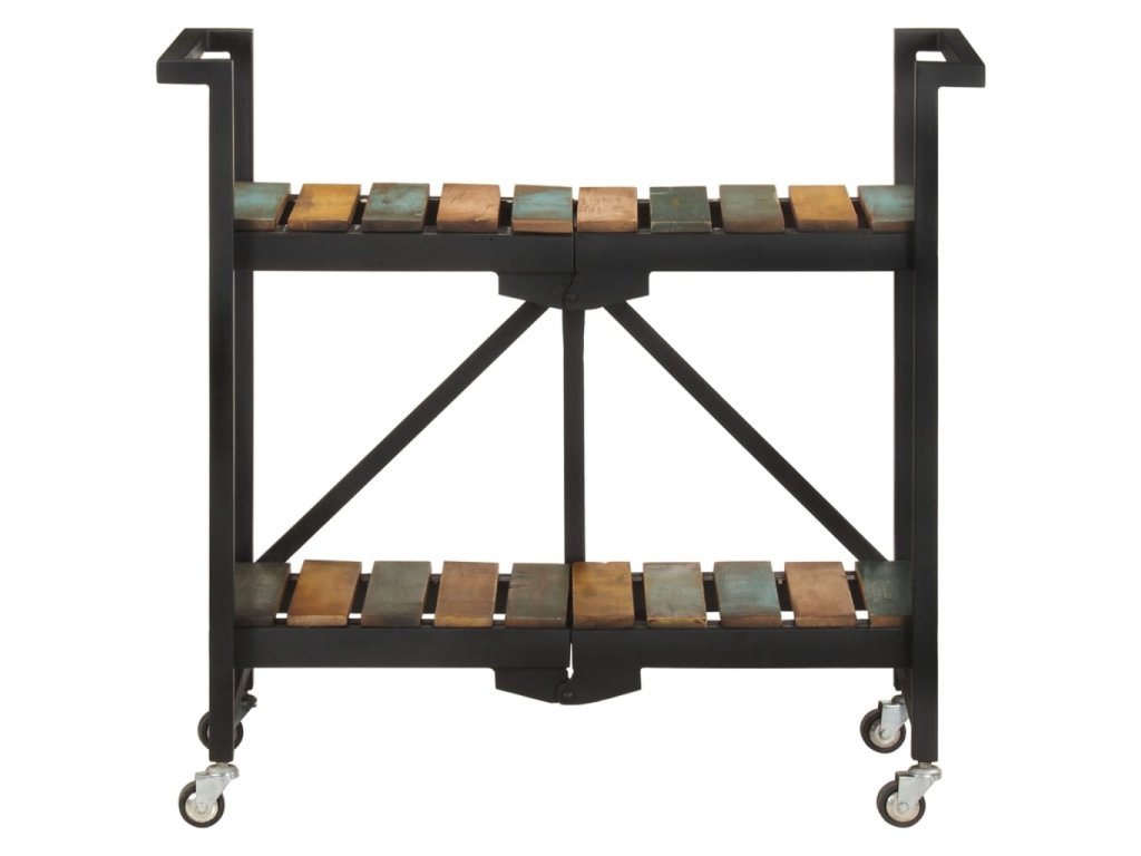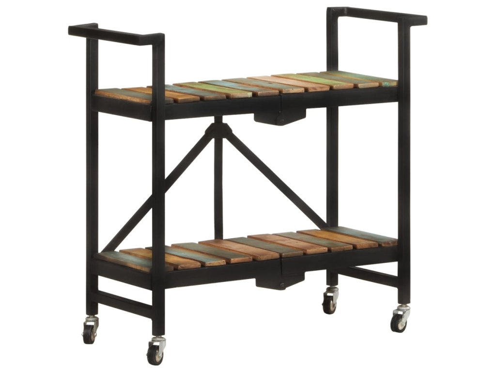 Kuchynský vozík je vyrobený z recyklovaného masívu, ktorý pochádza z trámov, podláh a nosníkov zo starých zbúraných stavieb a pozostáva z rôznych typov dreva, ako napríklad tíkového, tvrdého, tropického či mangovníkového dreva. Recyklované drevo sa preto vyznačuje vlastnosťami týchto typov dreva. Recyklované drevo je staré, zvetrané a usušené, a preto sa nezmršťuje ani neohýba. Pevnosť dodáva aj oceľový rám s práškovým nástrekom. Tento skladovací vozík má 2 priehradky na uloženie potravín, fliaš a ďalších potrieb na dosah ruky. Vďaka skladaciemu designu je možné policový vozík ľahko uložiť, keď sa nepoužíva. Kuchynská polica je navyše vybavená flexibilnými kolieskami pre ľahké posúvanie.