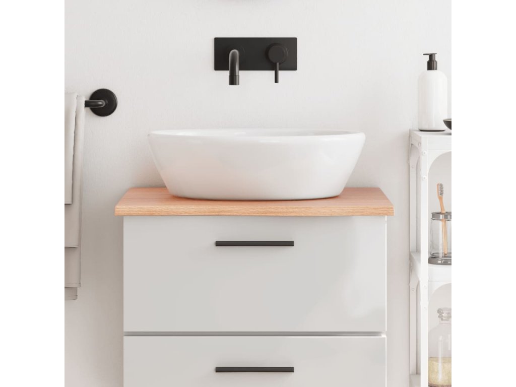 - Odolná konštrukcia: Táto kúpeľňová pracovná doska je vyrobená z masívneho dubového dreva, ktoré je krásnym prírodným materiálom. Dubové drevo má stredne hnedú farbu a hustú kresbu, čo prispieva k jeho jedinečnému vzhľadu.