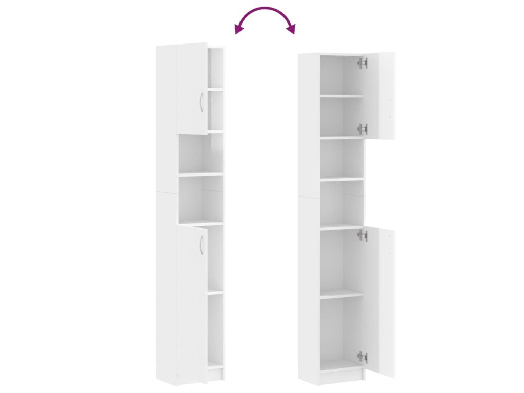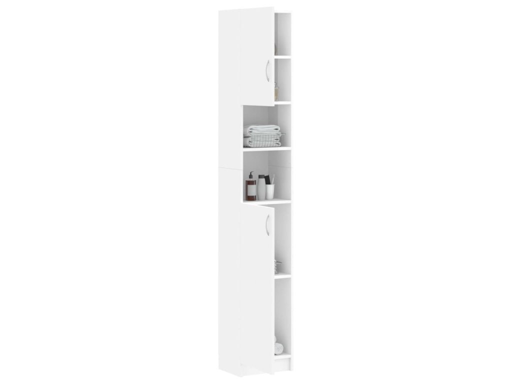 Naša elegantná kúpeľňová skrinka je vyrobená z kvalitného kompozitného dreva, vďaka čomu je robustná a stabilná. Vysoká skrinka má 4 police s dvierkami a 2 otvorené police, ktoré ponúkajú niekoľko možností skladovania a veľký úložný priestor na odkladanie rôznych predmetov v kúpeľni. Skrinka sa dá ľahko očistiť navlhčenou handričkou. Úložná skrinka sa okrem toho jednoducho montuje pomocou montážnych materiálov, ktoré sú súčasťou balenia.