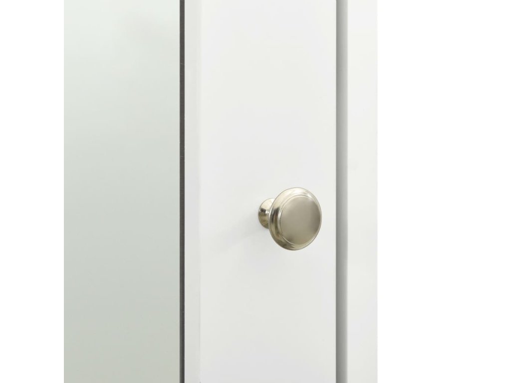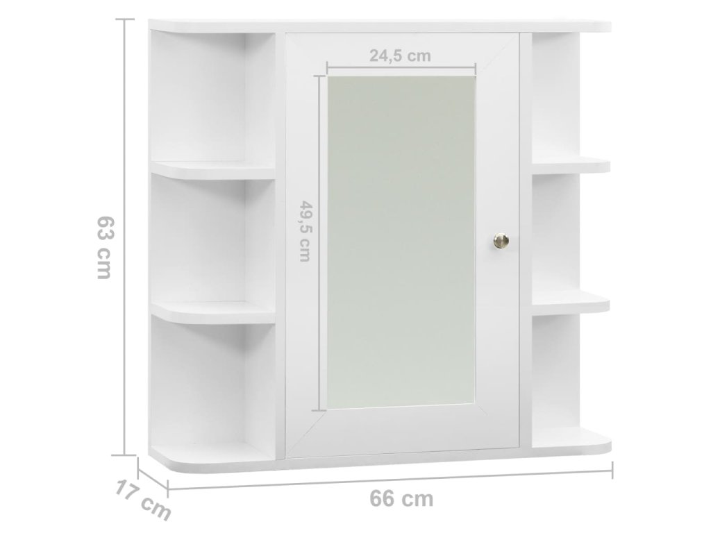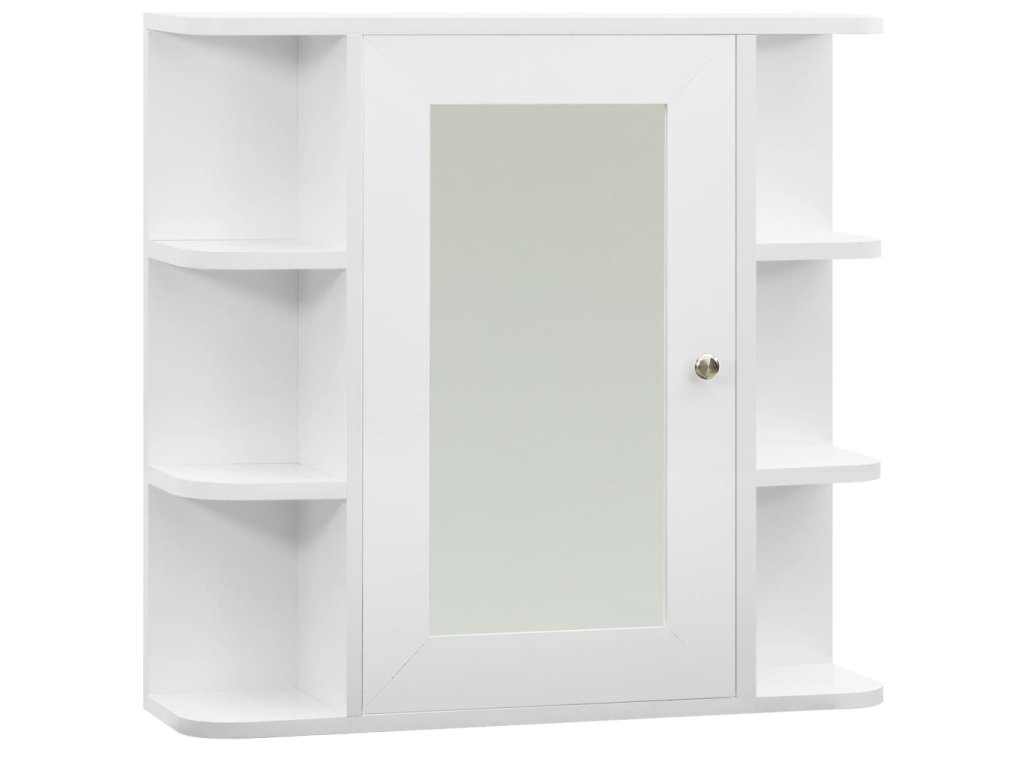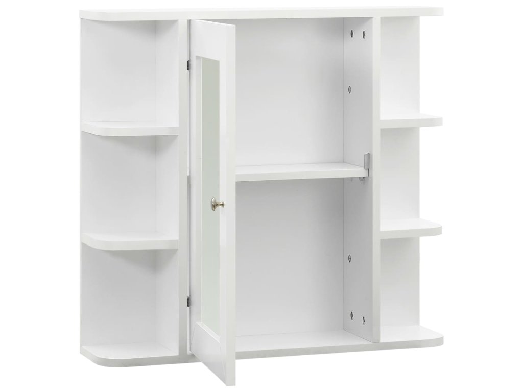 Nástenná skrinka so zrkadlom je vyrobená zo skla a MDF s melamínovým povrchom, vďaka čomu je trvácna a stabilná. Skrinka má 1 dvierka a spolu 8 priečinkov. 6 vonkajších priečinkov poskytuje dostatok úložného priestoru a 2 vnútorné priečinky ponúkajú ďalšie miesto na odkladanie rôznych predmetov. Zaručene sa do nich zmestia všetky toaletné a kozmetické potreby, ako napríklad mydlá, šampóny, zubné pasty a podobne.