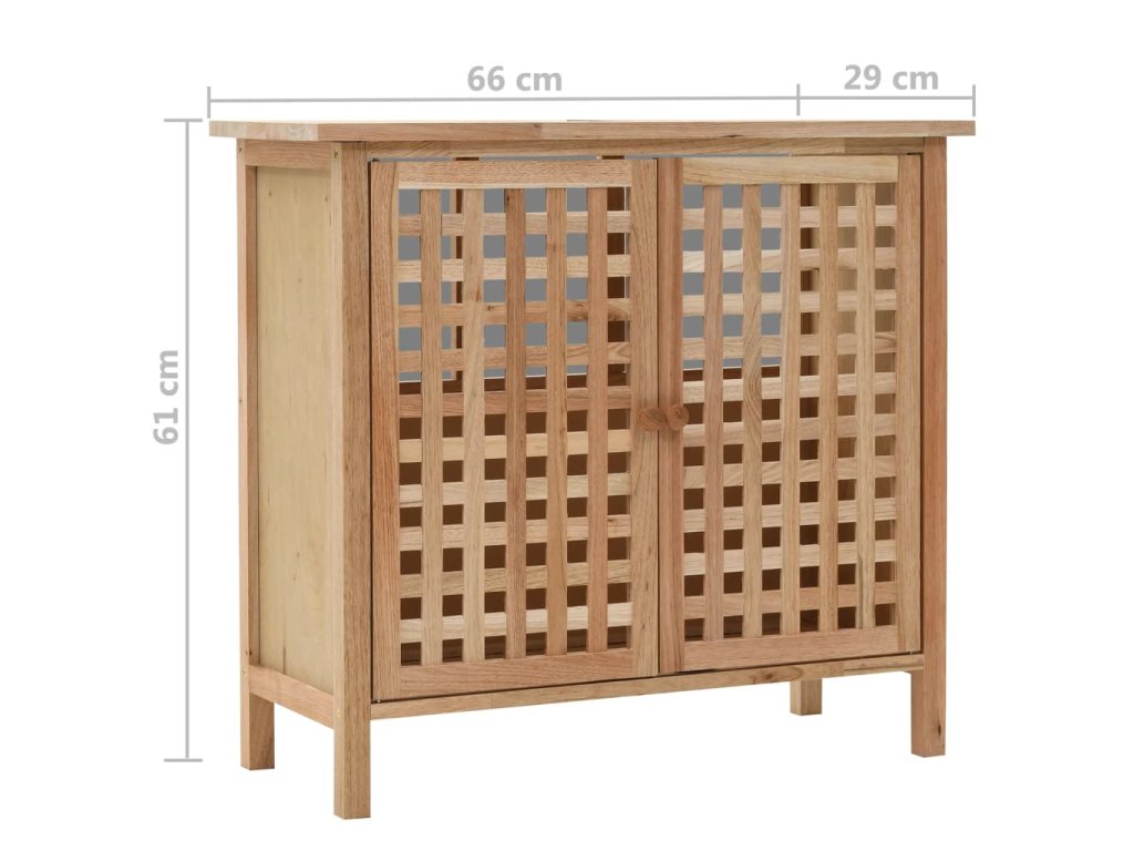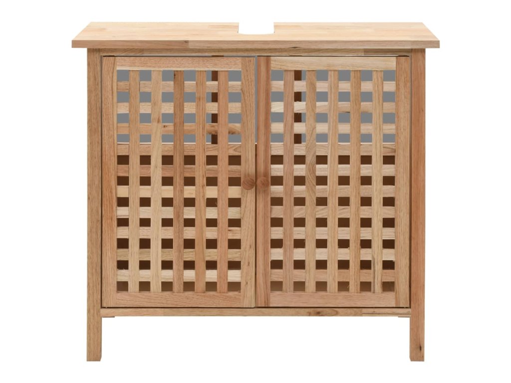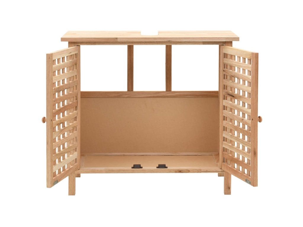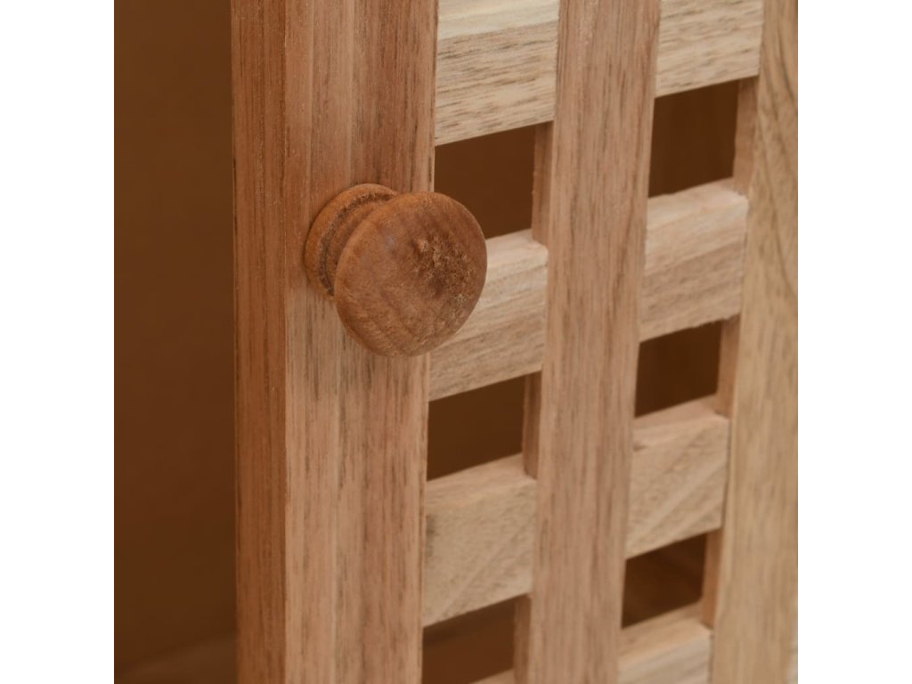 Kúpeľňová úložná skrinka má dvoje dvierka s mriežkovým dizajnom, ktorý pomáha udržiavať predmety vetrané, no taktiež skrinke dodáva elegantný štýl. Drevená skriňa je stabilná, odolná a dodá vašej domácnosti prírodný nádych.