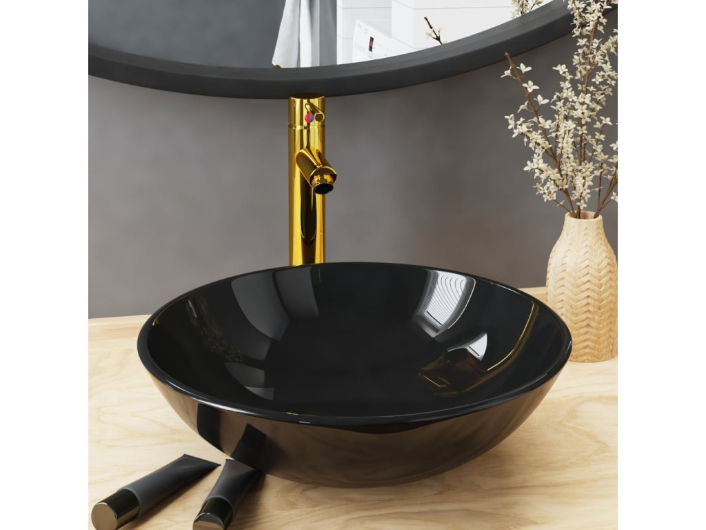 Toto okrúhle kúpeľňové umývadlo s batériou a tlačidlovým odtokom je navrhnuté tak, aby sedelo na doske a pútalo pozornosť svojím jedinečným štýlom.