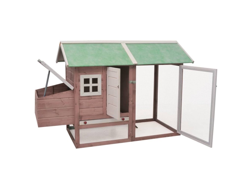 Konštrukcia zo železného drôteného pletiva vám umožní sliepky kedykoľvek skontrolovať a vaše domáce zvieratá zas budú môcť dýchať čerstvý vzduch. Kurín má rám z vysokokvalitného dreva, takže vám vydrží celé roky. Zelená strieška zvieratá ochráni pred dažďom a pohodlný koterec poskytuje príjemné miesto na spanie. Z prízemia vedie rebrík, po ktorom sa dá ľahko vyliezť na poschodie. Vďaka vyťahovaciemu dnu sa klietka dá bez problémov vyčistiť. Dvierka sa ľahko zatvárajú a dajú sa uzamknúť zasunutím západky.