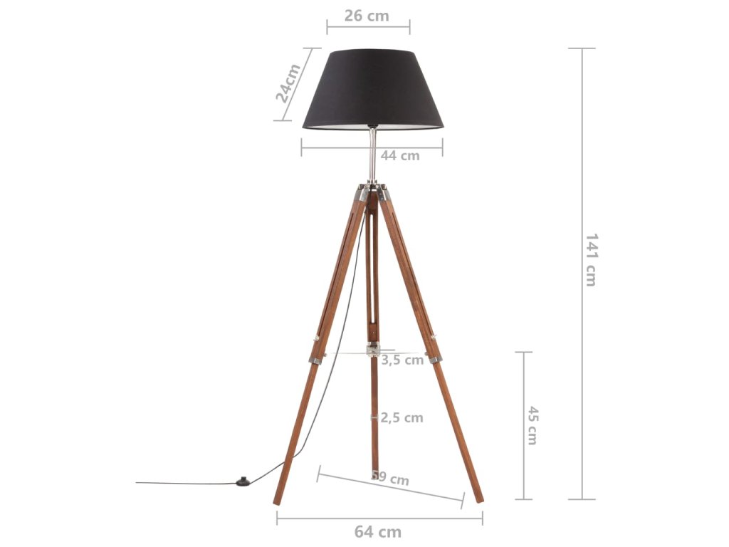 Lampa sa dodáva s tienidlom a stojanom v tvare statívu. Nohy sú vyrobené z masívneho teakového dreva, ktoré zaisťuje stabilitu. Výšku môžete nastaviť od 100 cm do 141 cm tak, aby vyhovovala vašim potrebám. Lampa má na kábli spínač pre jednoduché používanie. Toto samostatne stojace svietidlo má objímku E27 pre žiarovku s maximálne 25 wattmi. Môžete si vybrať a inštalovať žiarovky E27 s rôznymi farbami svetla. Poznámka: V balení sa žiarovky nenachádzajú.