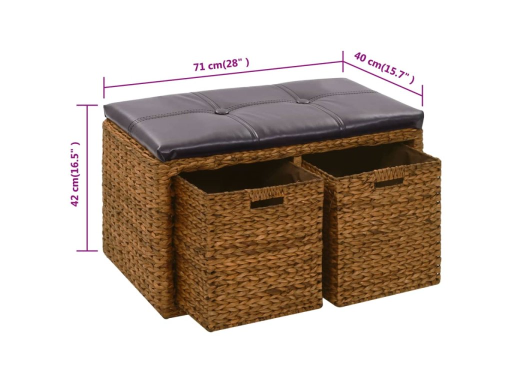 Táto lavica je vyrobená z morskej trávy a dodá akejkoľvek miestnosti rustikálny a prírodný nádych. Jej dva košíky pod sedadlom poskytujú dostatok úložného priestoru na úhľadné uloženie rôznych vecí, ktoré potrebujete mať na dosah ruky. Sedák zvyšuje pohodlie počas sedenia. Lavica je už zostavená a žiadna dodatočná montáž nie je potrebná.