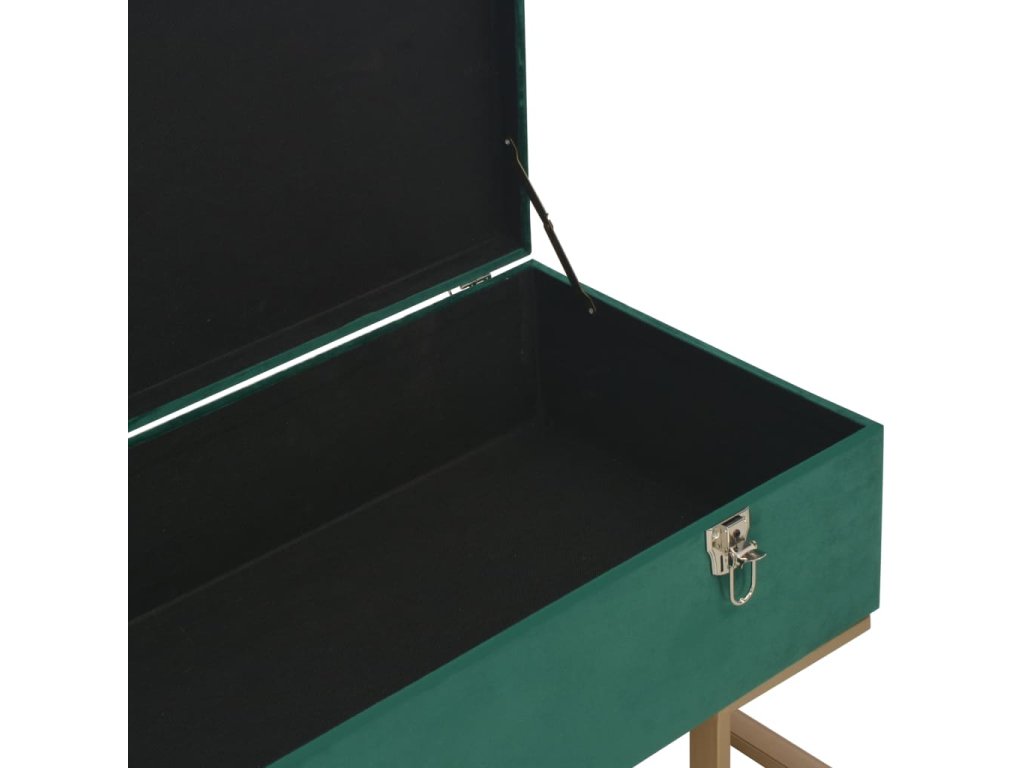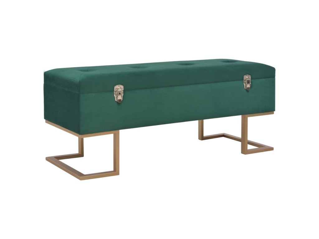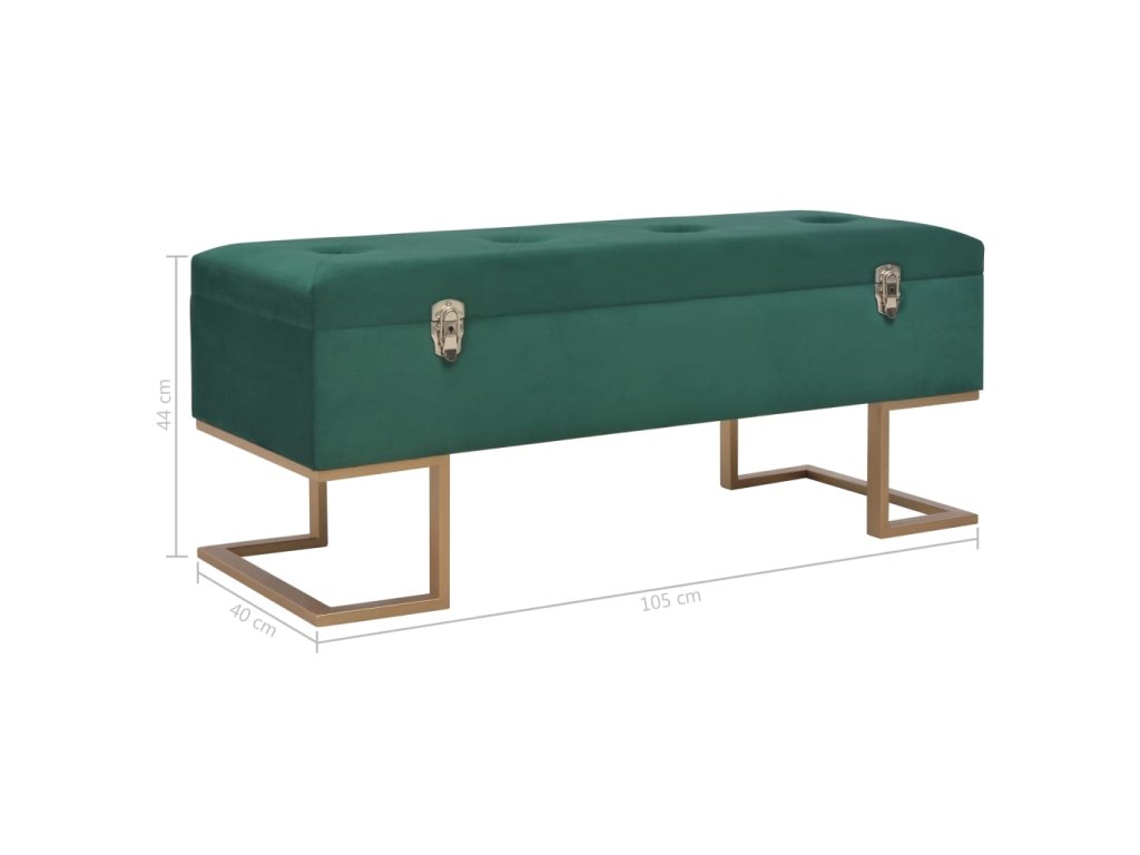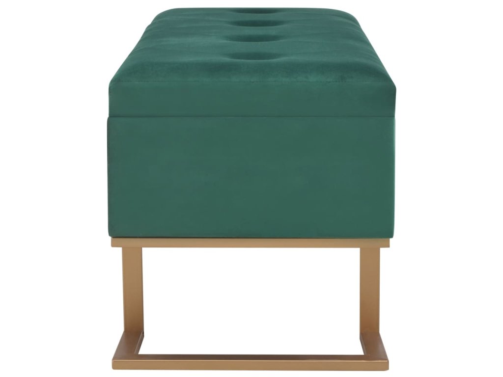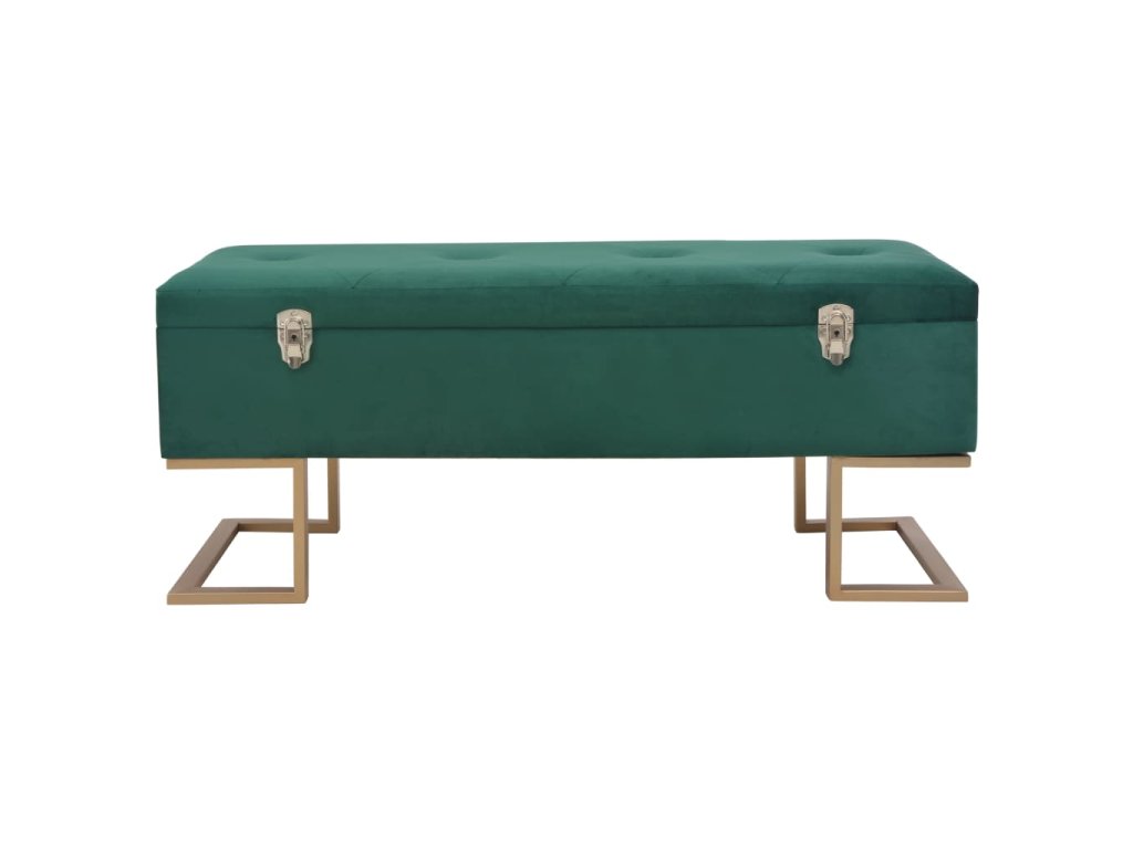 Zelený zamatový poťah je mäkký na dotyk a veľmi príjemný a do vášho interiéru vnesie poriadnu dávku farby. Lavička má vnútorný úložný priečinok, ktorý vám poskytne dodatočný priestor na odkladanie rôznych predmetov. Železné nohy s práškovou povrchovou úpravou a so zlatým náterom lavičke okrem toho dodávajú potrebnú stabilitu a trvácnosť. Naša lavička predstavuje okúzľujúci ozdobný doplnok do vašich priestorov a stane sa nepostrádateľnou súčasťou vašej izby.