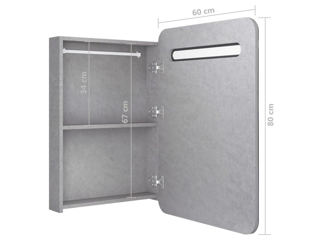 Je vyrobená z kvalitnej MDF dosky s melamínovým povrchom, čo zaručuje dlhodobé použitie. Vďaka integrovanej LED trubici sa budete vidieť v tom najlepšom svetle pri nanášaní make-upu, česaní a starostlivosti o pleť. Osvetlí tak nielen vašu izbu, tvár, ale aj úsmev. Dve poličky ponúkajú dostatok úložného miesta vo vašej kúpeľni. Jednoducho do nich uložíte svoje základné toaletné potreby a kozmetiku, ako sú mydlá, šampóny, zubnú pastu atď. Táto štýlová a funkčná skrinka dodá vašej kúpeľni originálny dizajn!